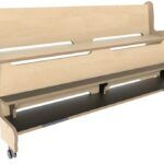 Hoogzit rechte ergo bank in berken voorzien van geremde wielen en dubbele voetenplank.