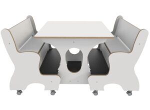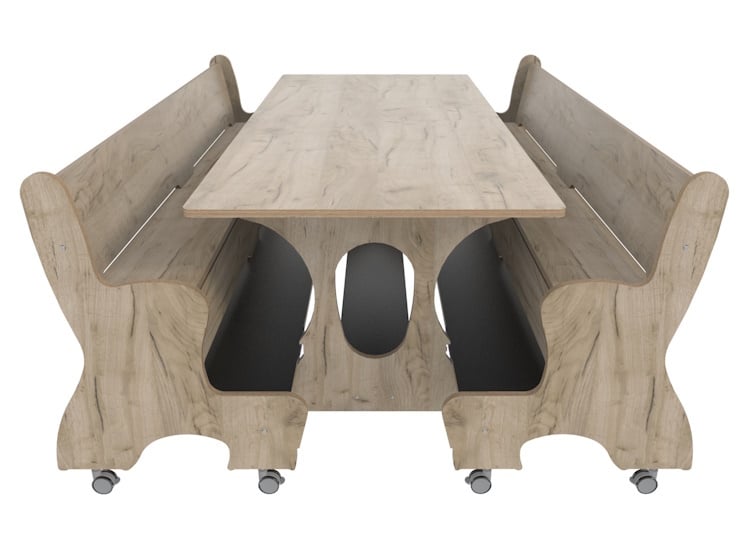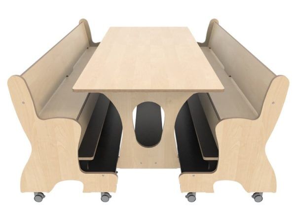 - Banken en tafel zijn opgebouwd uit 18 mm berken multiplex met standaard HPL toplaag, deze is zeer slijt en krasvast.