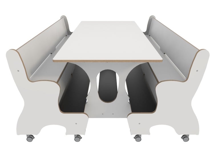 - Banken en tafel zijn opgebouwd uit 18 mm berken multiplex met standaard HPL toplaag, deze is zeer slijt en krasvast.