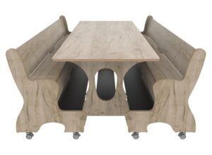 - Bank en tafel zijn opgebouwd uit 18 mm berken multiplex met standaard HPL toplaag, deze is zeer slijt en krasvast.