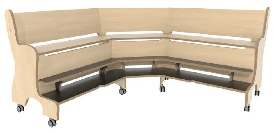 Hoogzit ergohoekbank in berken en met dubbele voetenplank. De hoekbank perfect bij de hoektafels. Inclusief magneetkoppelsysteem, zodat kinderen de tafel en bank niet uit elkaar kunnen duwen.