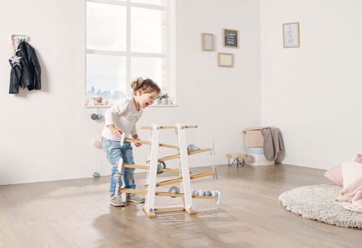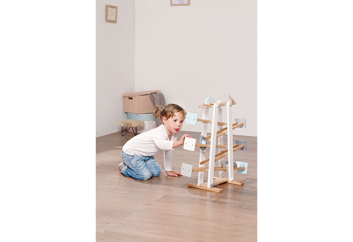 De hoogwaardige afwerking en het robuuste beukenhout maken van de knikkerbaan een duurzaam speelgoed voor kinderen bevordert op speelse wijze de motoriek en coördinatie van kleine ontdekkingsreizigers en is daarom een waardevol educatief speelgoed.