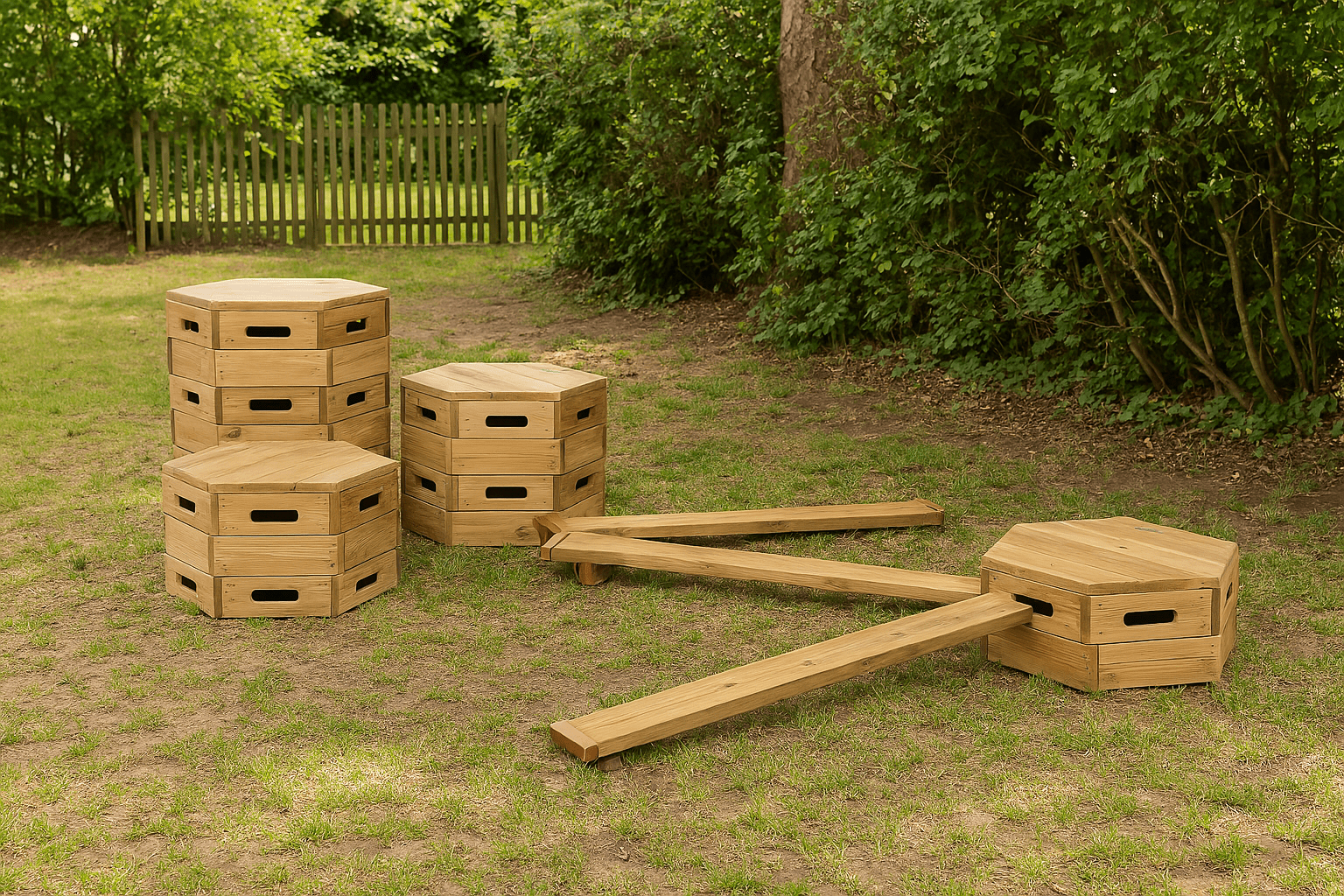 Deze veelzijdige buiten klimset van hoogwaardig Fins grenenhout daagt kinderen uit om te klimmen, balanceren en hun eigen parcours te bouwen. De set bestaat uit hexagonale platformen (48,9 x 42,4 x 10,5 cm) en lange planken (100 x 9,5 x 2 cm), waardoor er eindeloos veel speelmogelijkheden ontstaan.