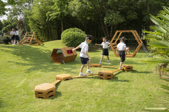 Deze veelzijdige buiten klimset van hoogwaardig Fins grenenhout daagt kinderen uit om te klimmen, balanceren en hun eigen parcours te bouwen. De set bestaat uit hexagonale platformen (48,9 x 42,4 x 10,5 cm) en lange planken (100 x 9,5 x 2 cm), waardoor er eindeloos veel speelmogelijkheden ontstaan.