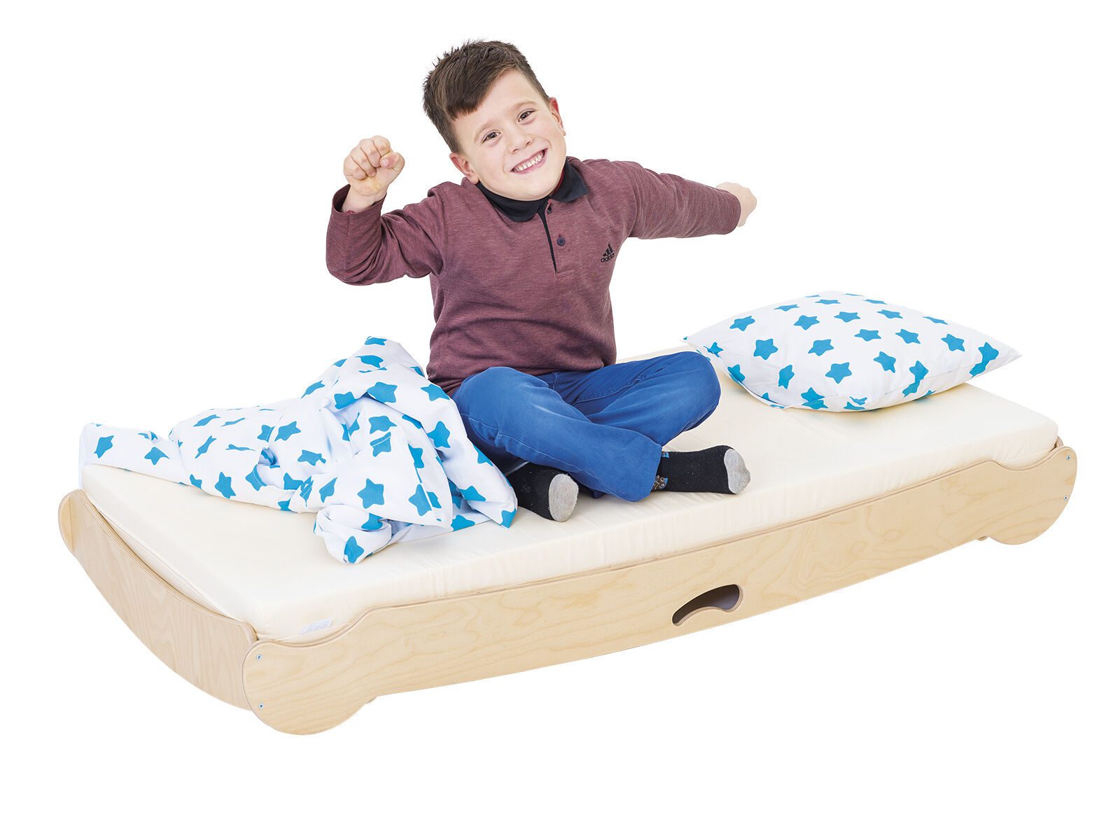 Laat uw kinderen zacht slapen op dit houten rustbed met matras. Het houten Bed is gemaakt van multiplex, het matras van zacht polyurethaanschuim met luchtdoorlatende katoenen hoes in beige kleur. Het matras bevat hoogwaardige materialen. De hoes bevat een verborgen rits en is afneembaar.