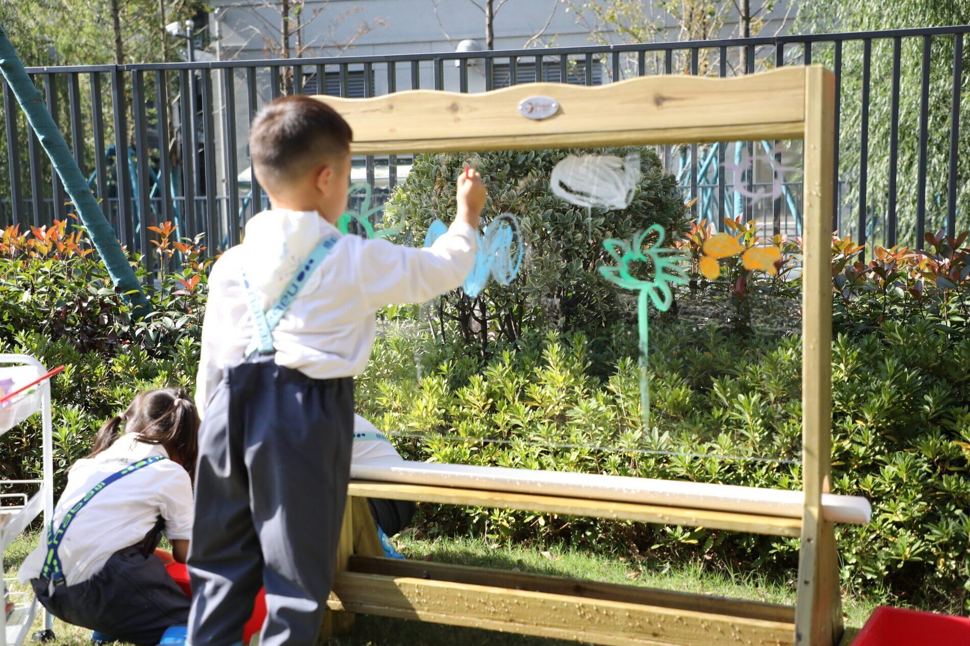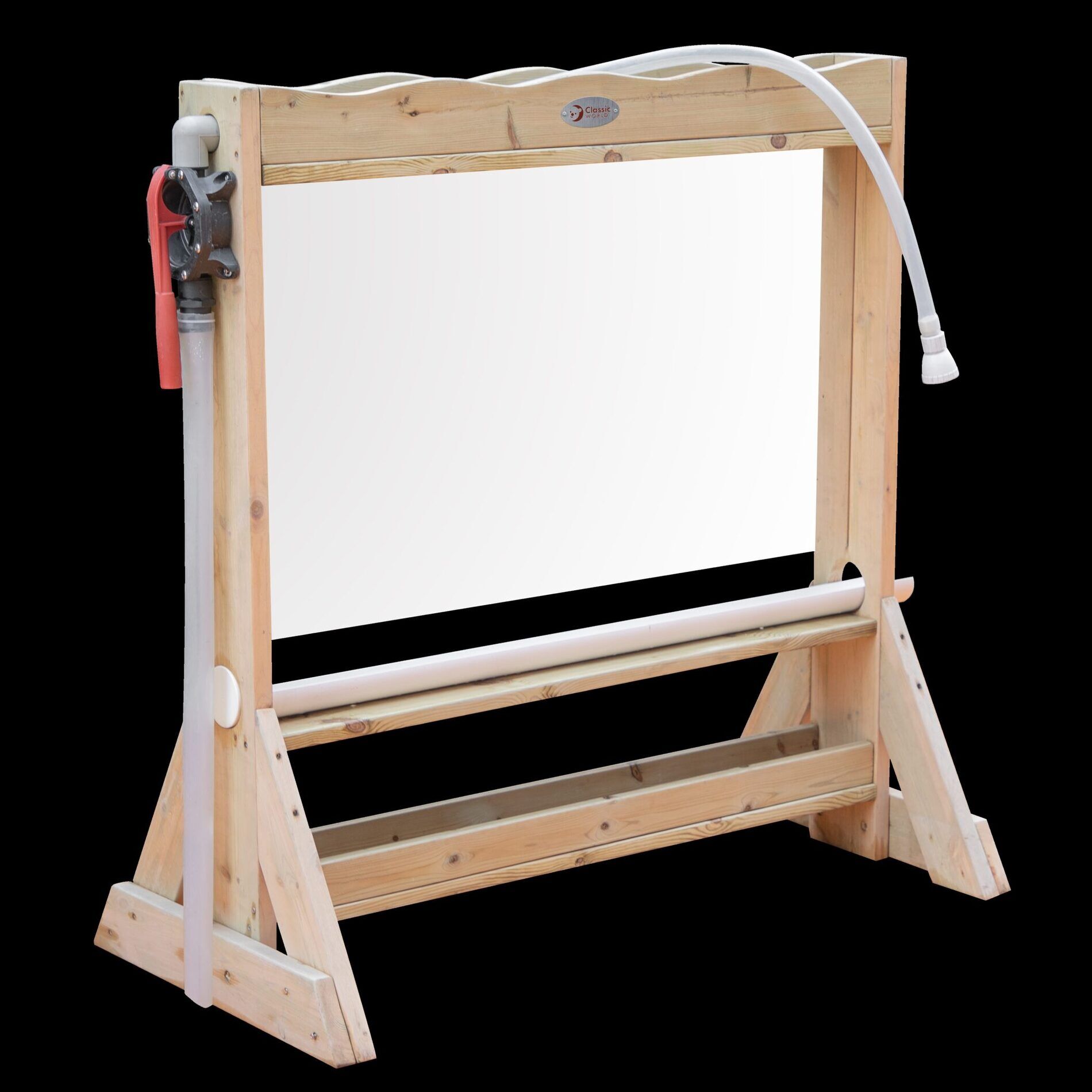 Gebouwd in een stevig houten frame, is het centrale kenmerk transparant acrylplaat die ideaal is voor verf op vinger- en waterbasis. Een geweldig apparaat voor schoonmaken met plezier van speelwater. Om 2 kinderen aan te moedigen samen te werken, één aan elke kant van het bord. Na het tekenen kunnen kinderen op de pomp drukken en water sproeien om het schoon te maken. Het is geweldig om te schilderen en ook om met water te spelen.
