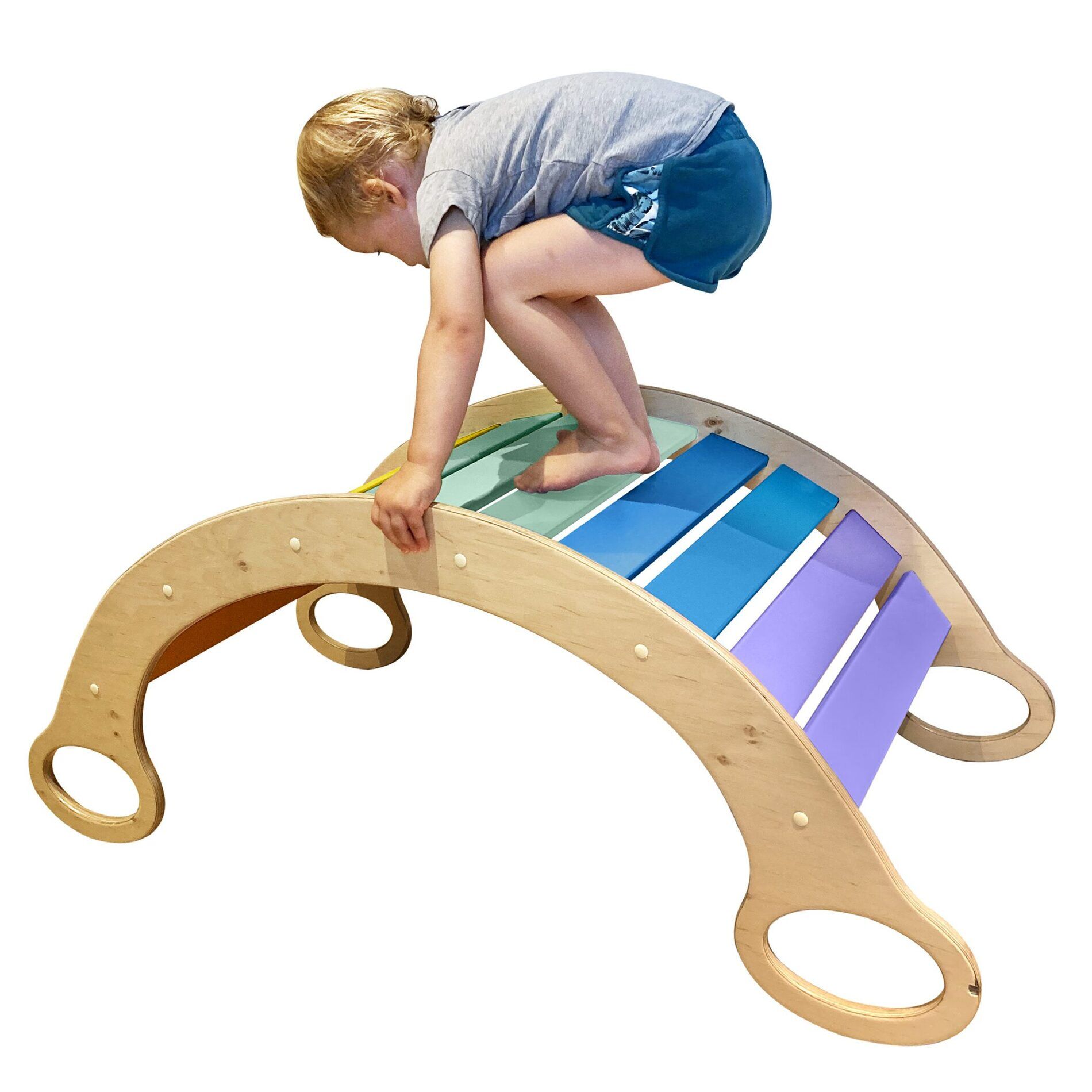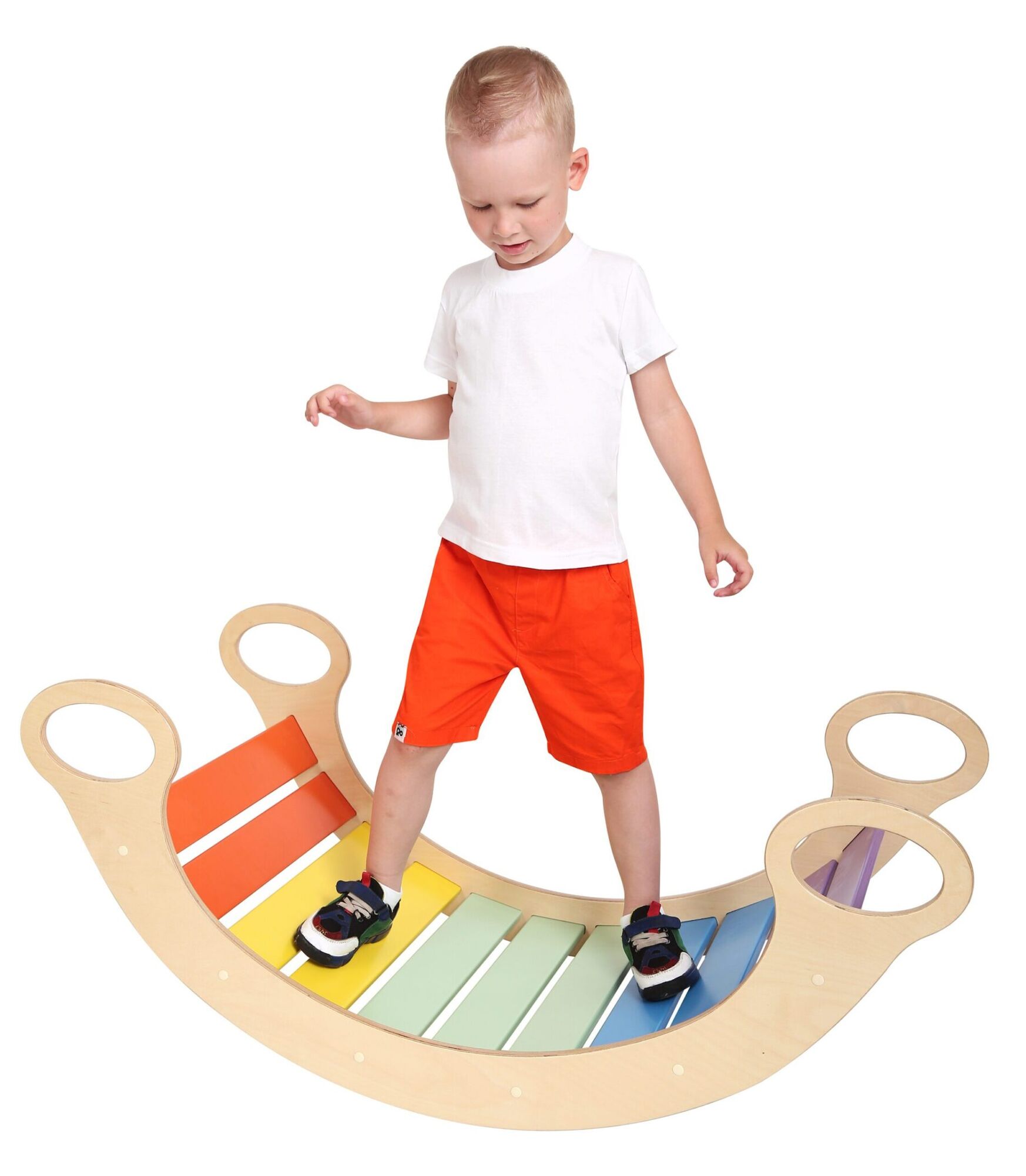 Deze houten schommeltunnel in aantrekkelijke kleuren is zowel een schommelstoel als een tunnel: De kinderen ontwikkelen zowel hun balans als hun hand-oog coördinatie door er onderdoor te kruipen of overheen te klimmen. Deze tunnel is ideaal om de benen en rugspieren te versterken en je houding te verbeteren.