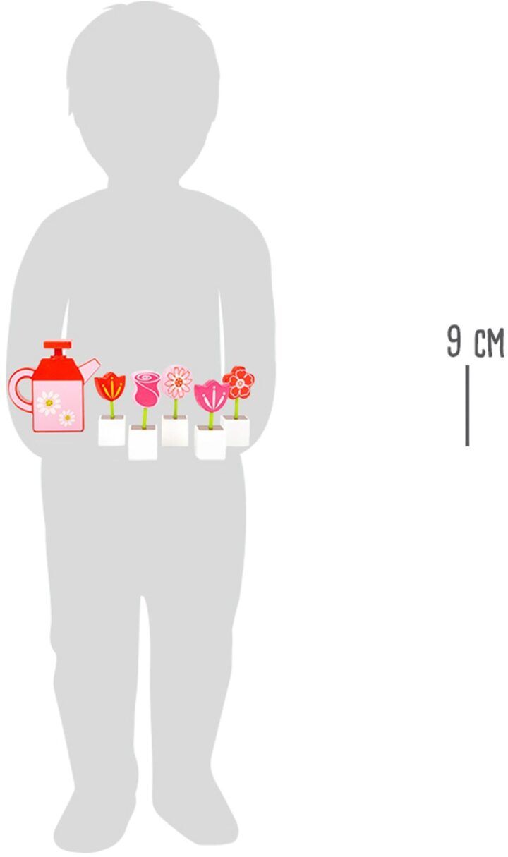 Met deze 11-delige set gemaakt van FSC® 100% -gecertificeerd hout, kunnen jonge tuiniers en bloemisten eenvoudig een hele kleurrijke bloemenzee creëren. Met de meegeleverde gieter voorzien van een handvat en pomp moeten de bloemen regelmatig water worden gegeven. Dit is hoe kinderen kunnen leren om te zorgen voor bloemen en planten met actief rollenspel. Het inbrengen van de bloemstengels in de bloempotten bevordert op speelse wijze fijne motoriek! Een geweldig cadeau dat niet alleen speelplezier biedt, maar ook een decoratief effect. Deze bloemen zullen elke kamer verfraaien!