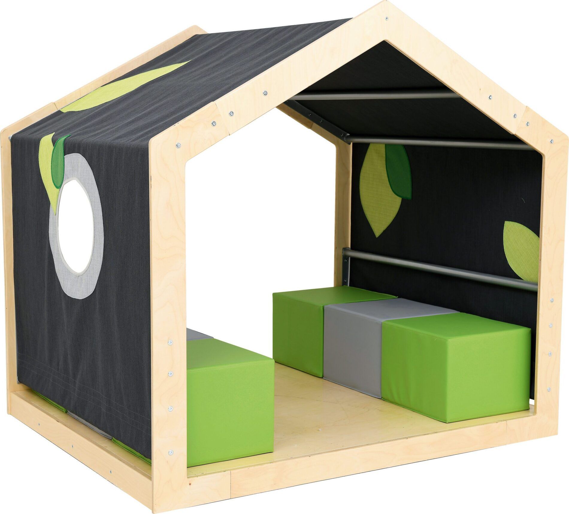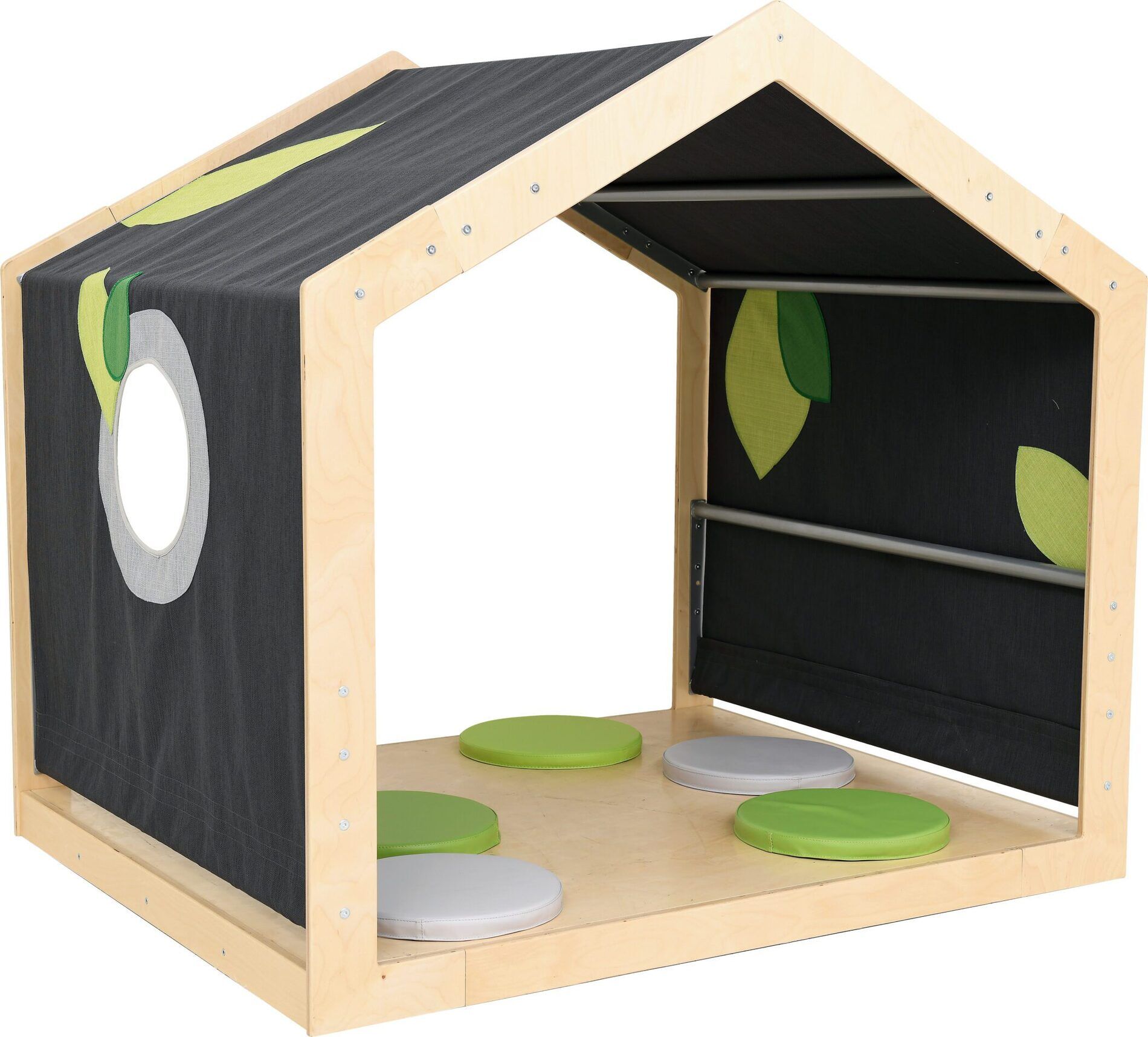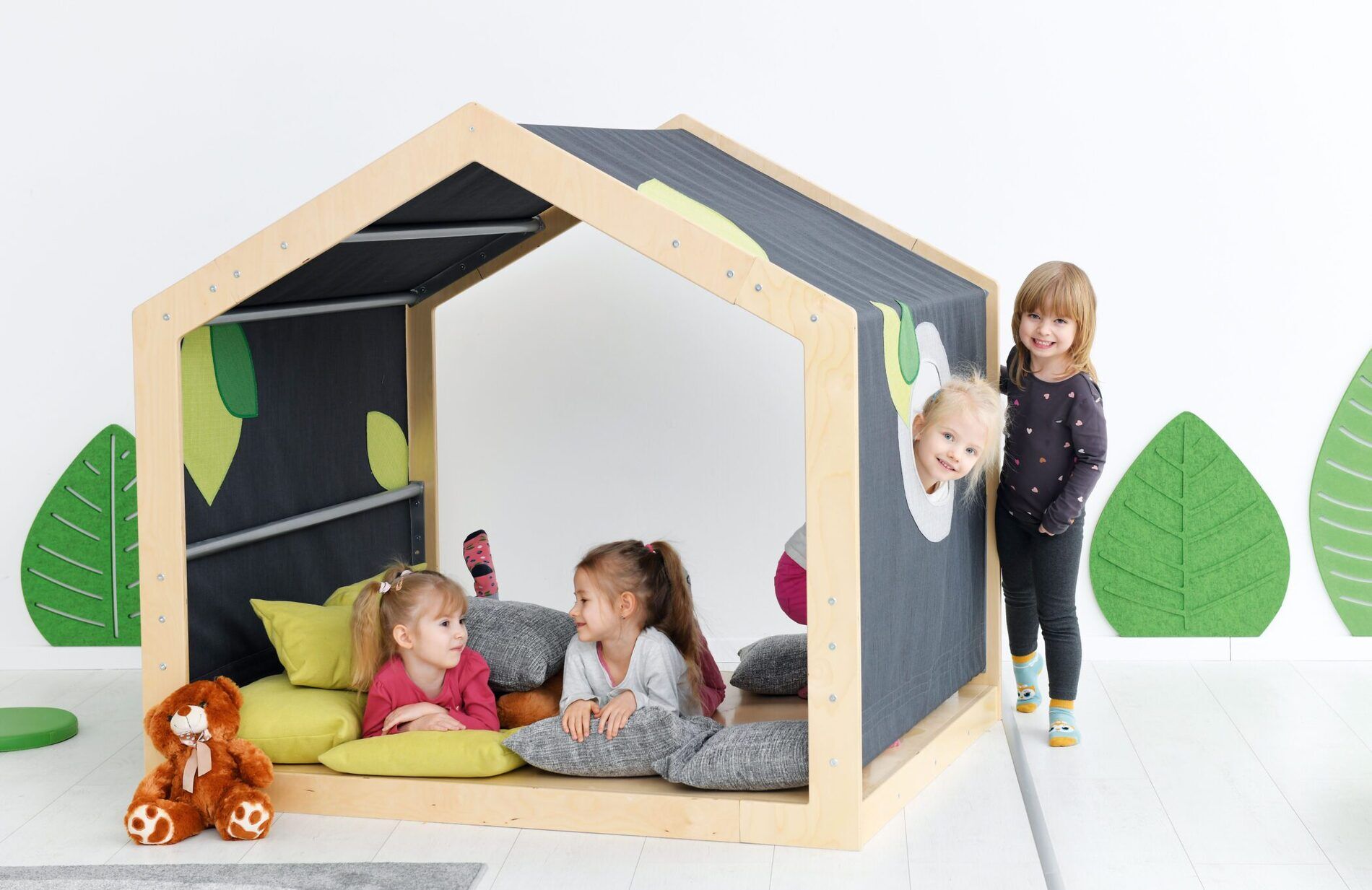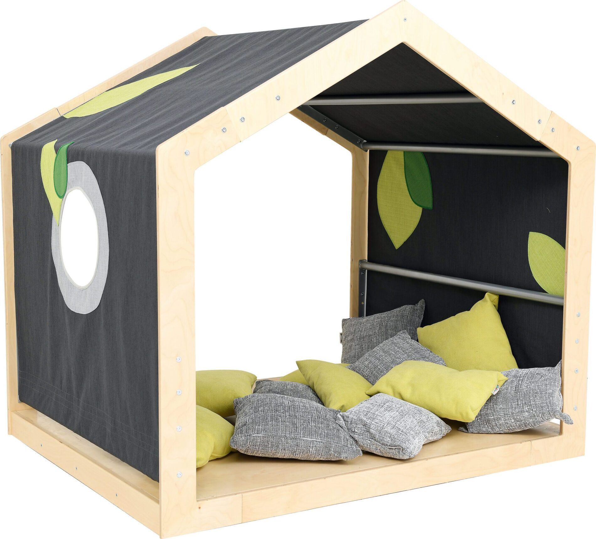 - Een speelhoek in de vorm van een huis: gemaakt van gelakt multiplex