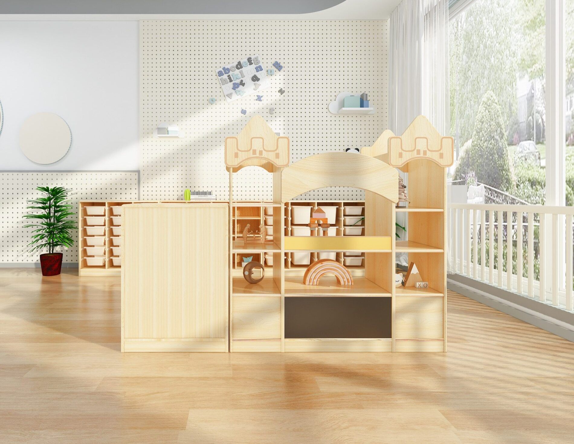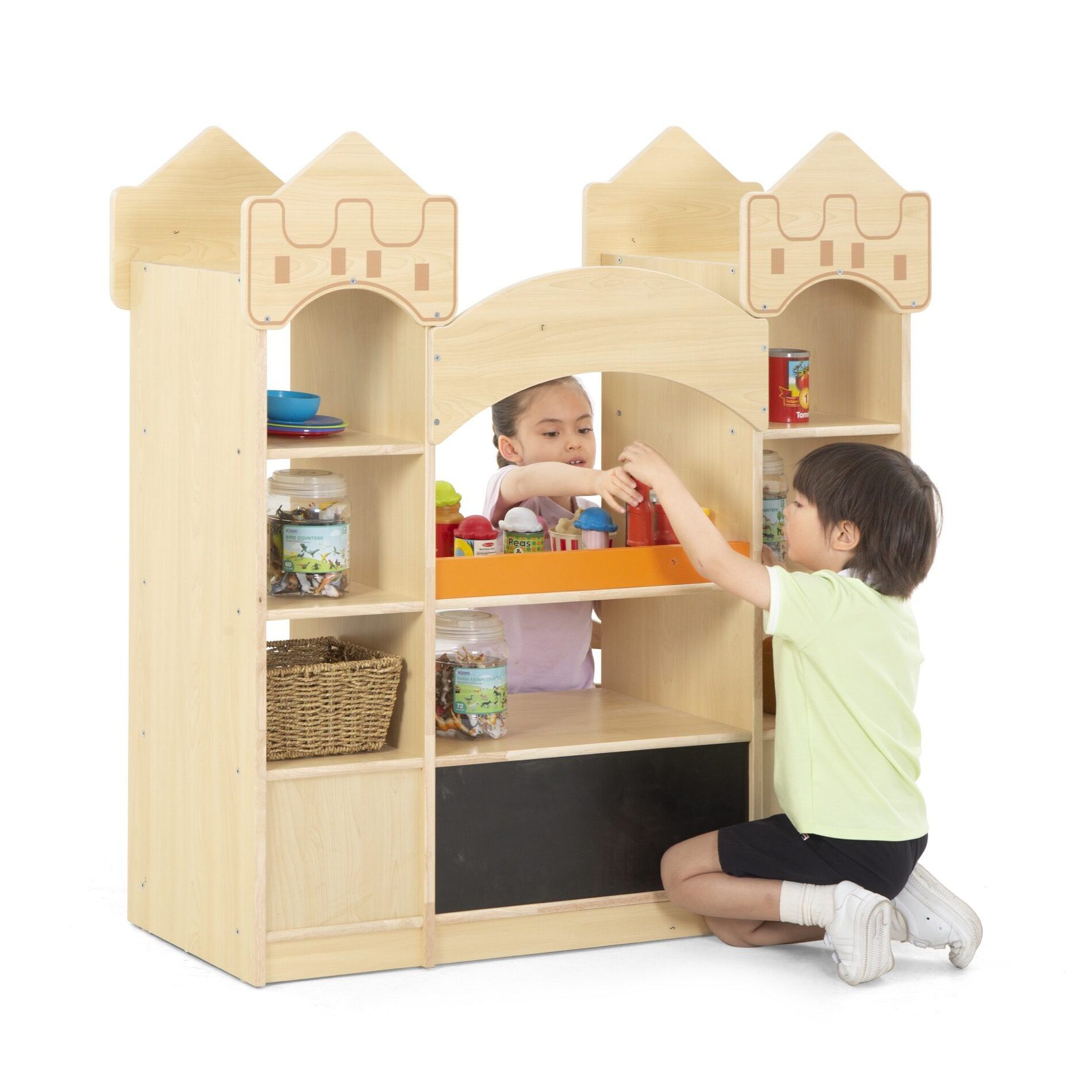 De prachtige grote speelburcht is perfect geschikt voor fantasierijk rollenspel. In de twee burchttorens kunnen bijvoorbeeld ridderfiguren en middeleeuwse spellen, sprookjesboeken en draken goed worden bewaard. Tijdens het spelen biedt de plank geweldige mogelijkheden door de vele niveaus van het spel. Op deze manier kunnen meerdere kinderen samen spelen en de burcht vanuit verschillende kanten gebruiken.
