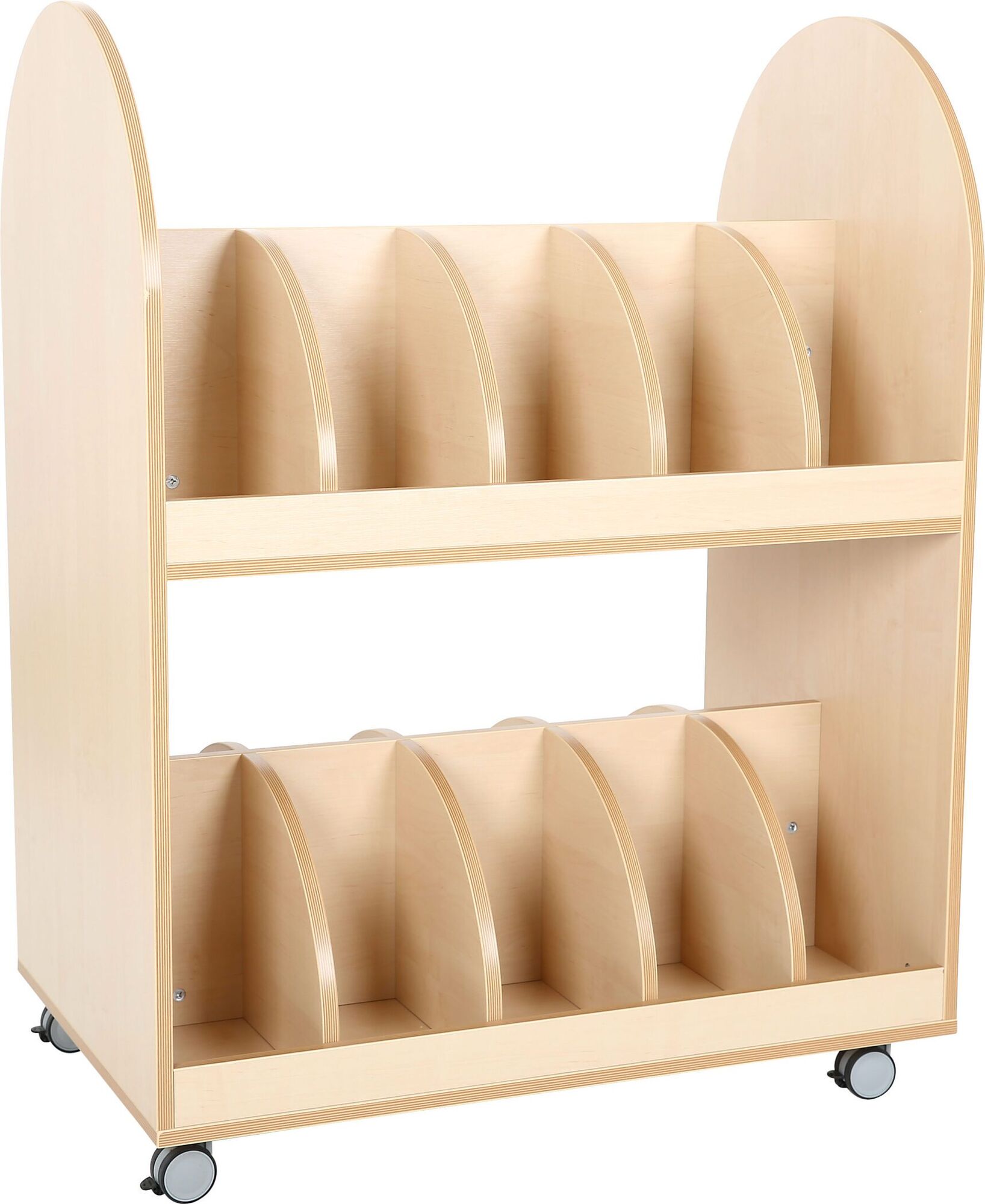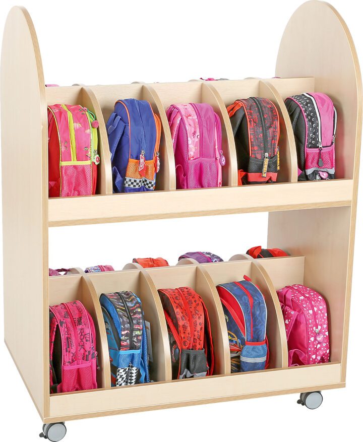 Deze houten tassenwagen biedt een praktische, overzichtelijke oplossing voor het opbergen van kleine rugzakken. Dankzij de twee niveaus en de 20 vakken is iedere tas direct zichtbaar en makkelijk bereikbaar. De kast is gemaakt van 18 mm dik gelamineerd materiaal in een warme berkenlook en staat op wendbare wielen met rem, waardoor je hem eenvoudig verplaatst én veilig vastzet.