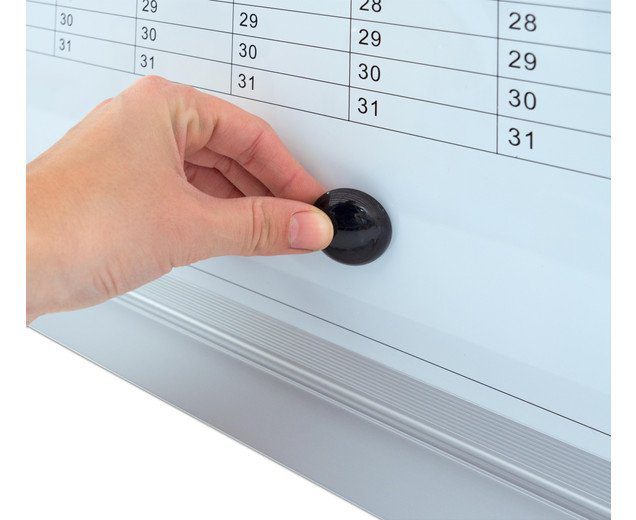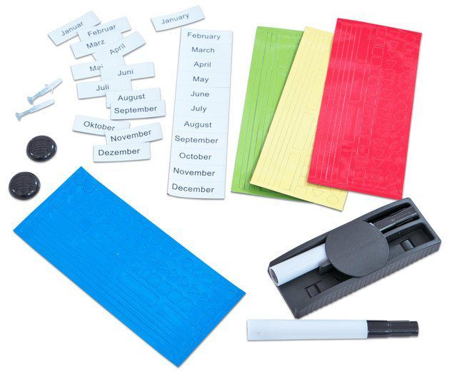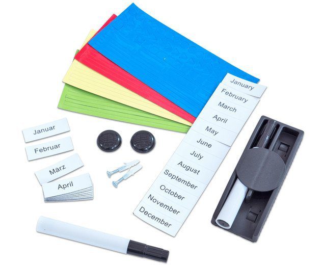 Gebruik de gekleurde magnetische symbolen om klasopdrachten, projecten of andere afspraken te markeren. Individuele kleuren kunnen bijvoorbeeld bepaalde onderwerpen vertegenwoordigen: blauw voor wiskunde, rood voor Engels, enz. U kunt de magnetische strepen gebruiken om vakanties en vakanties te markeren. Gebruik een afveegbare marker om uw respectievelijke datums en verjaardagen op te schrijven. Volgend jaar wordt alles gewoon weggeveegd en opnieuw gelabeld. Daarnaast zijn er whiteboardgebieden voor gratis labelling in de linker- en lagere gebieden.