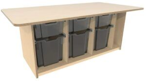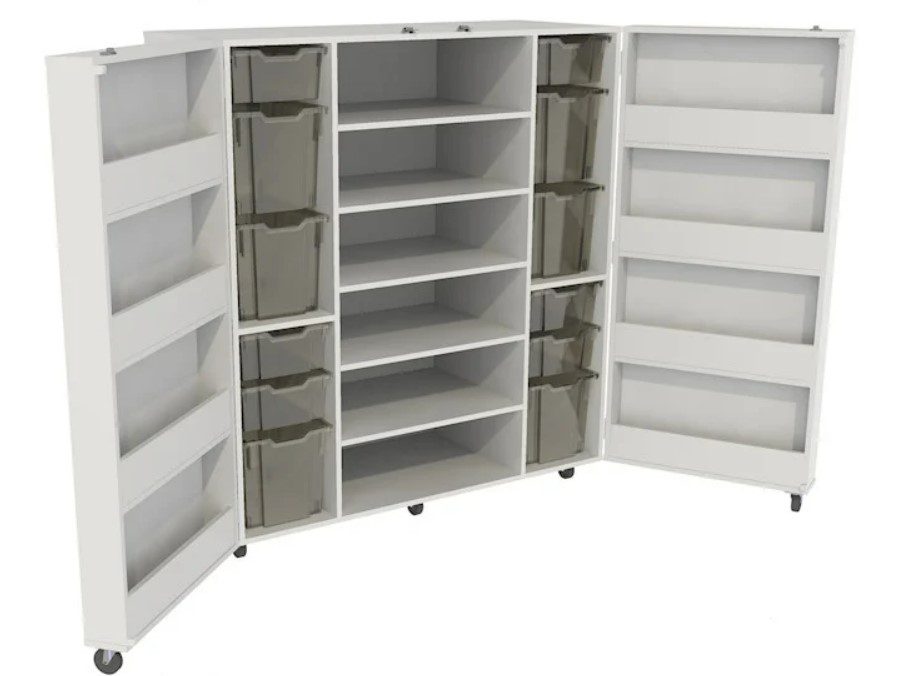 Grote knutselkast op geremde wielen. Deze kast biedt veel praktische bergruimte: de deuren zijn voorzien van handige vakken en in de meegeleverde kunststof bakken kunnen veel kwasten, verfpotjes en ander knutselmateriaal worden opgeborgen. .