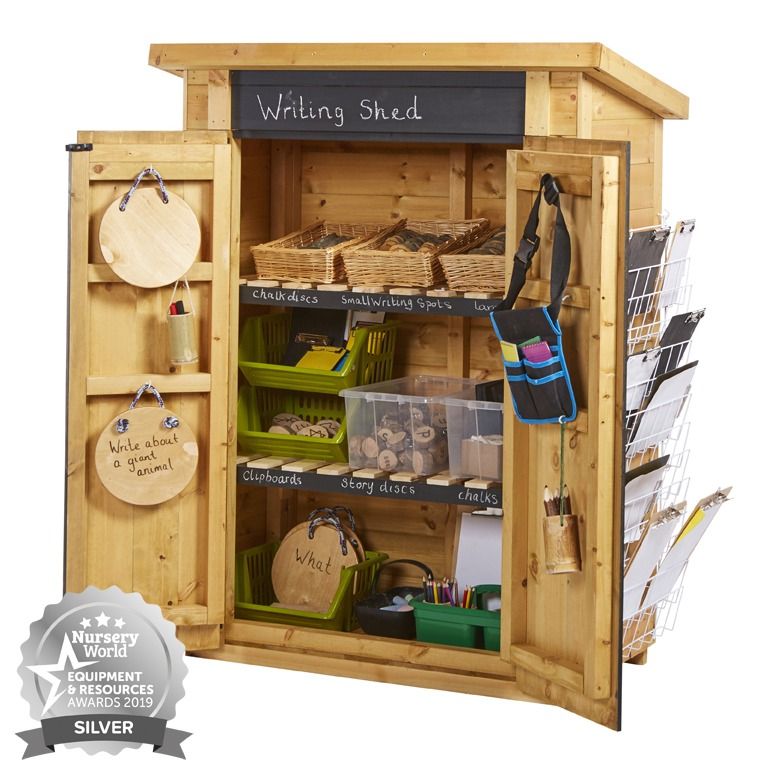 Uniek in de kinderopvang: Specifieke opbergkasten voor buiten. Bewaar al uw markeer- en schrijfbenodigdheden in dit fraai ogende opbergmeubel voor buiten. Ondersteun zelfstandig leren door kinderen zelf haar spullen te laten pakken op de onderste planken, en bewaar minder gebruikte spullen bovenin. Door de slimme integratie van een schoolbord aan de voorkant kan elke dag een woord worden toegevoegd om beginnende lezers aan te moedigen!