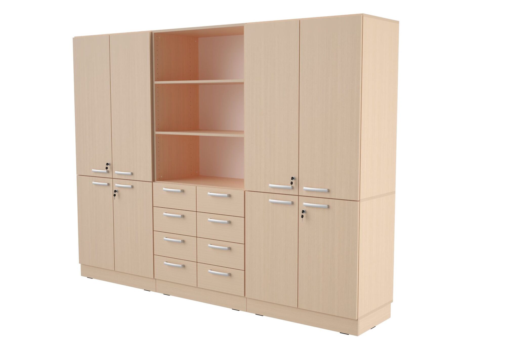 Deze prachtige kastenwand combineert een enorme hoeveelheid opbergruimte met een rustige, moderne uitstraling. De combinatie van royale gesloten kasten, open vakken en een reeks praktische lades maakt deze wand ideaal voor het overzichtelijk opbergen van materialen, documenten, spelletjes of klasbenodigdheden.