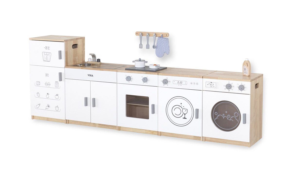 Een degelijke en zeer mooi afgewerkte speelkeuken in een prachtige 5 - deligeuitvoering. De keuken is gemaakt van massief rubberwood (qua hardheid vergelijkbaar met beukenhout) en alle delen zijn afgewerkt met een slijtvaste laklaag.