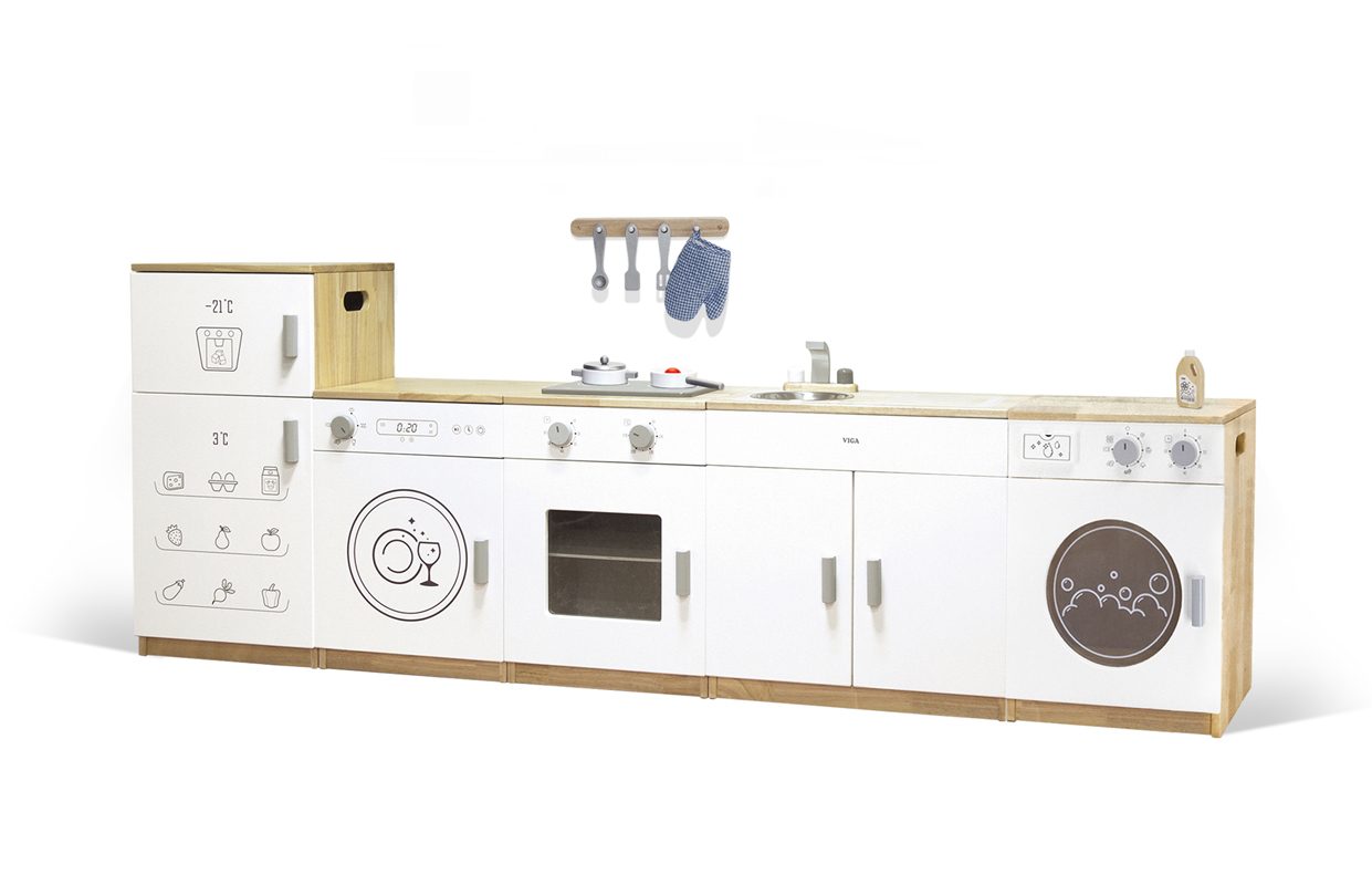 Een degelijke en zeer mooi afgewerkte speelkeuken in een prachtige 5 - deligeuitvoering. De keuken is gemaakt van massief rubberwood (qua hardheid vergelijkbaar met beukenhout) en alle delen zijn afgewerkt met een slijtvaste laklaag.