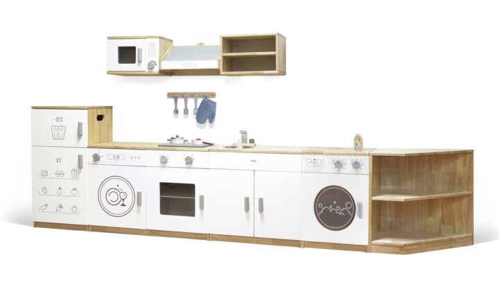 Een degelijke en zeer mooi afgewerkte speelkeuken in complete uitvoering. De keuken is gemaakt van massief rubberwood (qua hardheid vergelijkbaar met beukenhout) en alle delen zijn afgewerkt met een slijtvaste laklaag.
