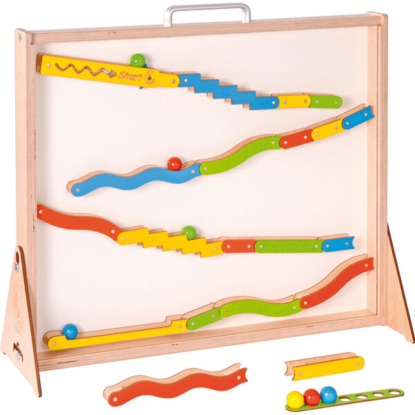 De magnetische sporen kleven aan het witte oppervlak en kunnen worden samengesteld tot steeds nieuwe kogelbanen door te experimenteren met vormen, hellingen en afstanden. Door de driehoekige voetjes te bevestigen, blijft de koffer staan als een plank.