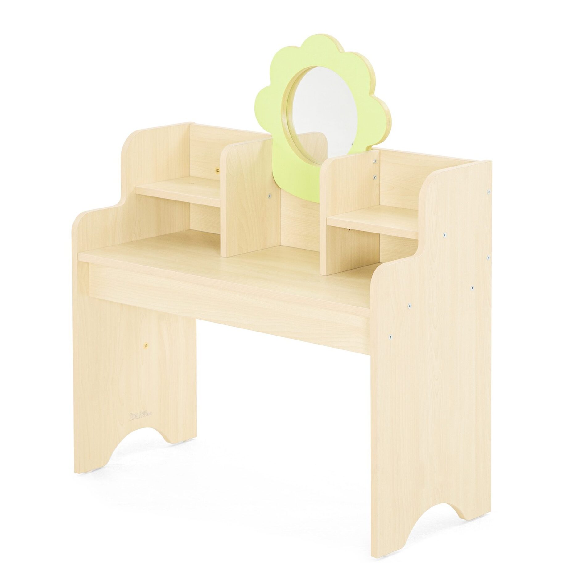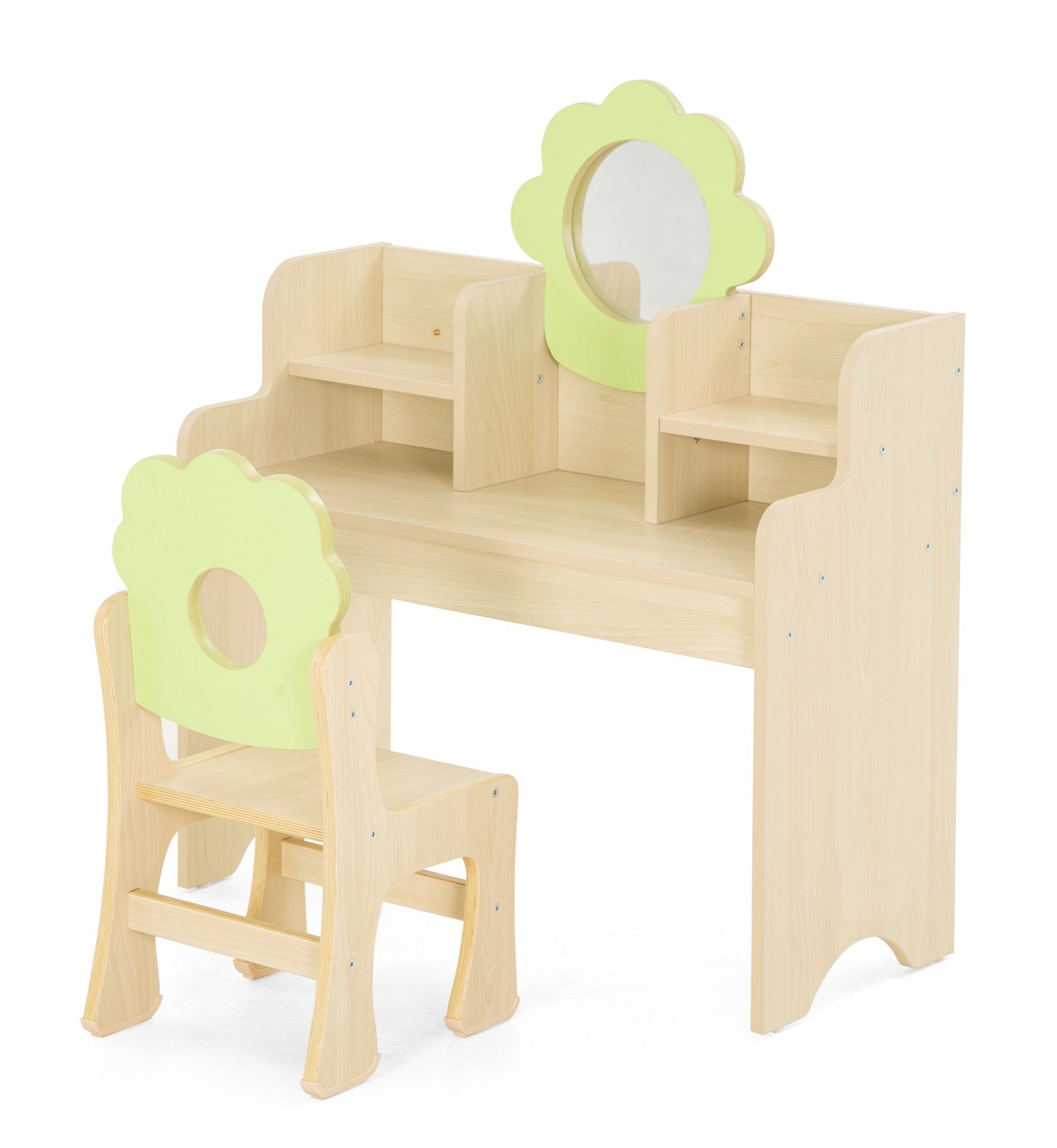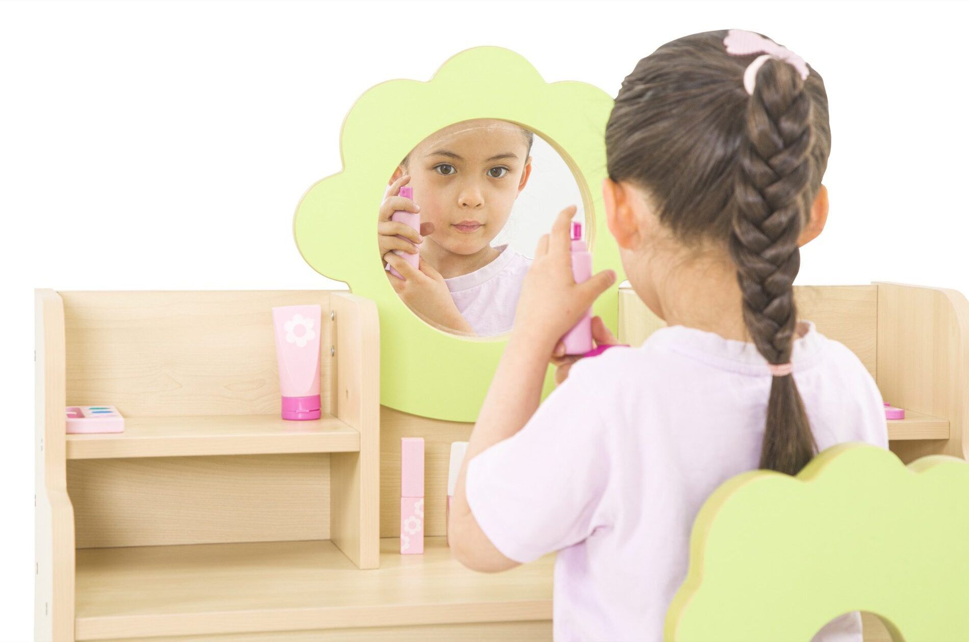 De make-uptafel is perfect voor rollenspellen. Hier kunnen kinderen verschillende kapsels uitproberen en zichzelf opmaken. Het bestaat uit een tafel met veel opbergruimte en een mooie ronde spiegel in een lichtgroene bloemenlijst. De zachte kleuren, met lichtgroen en esdoorn decor, maken de make-uptafel tot een geliefd speelmeubel in de hoek voor rollenspellen.