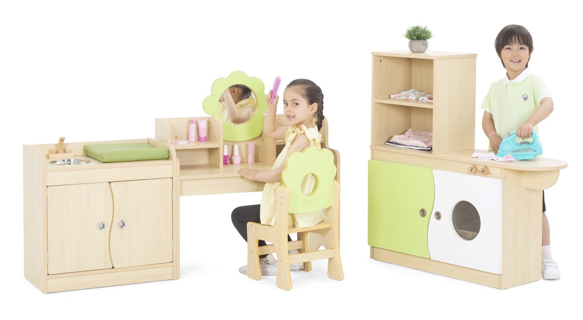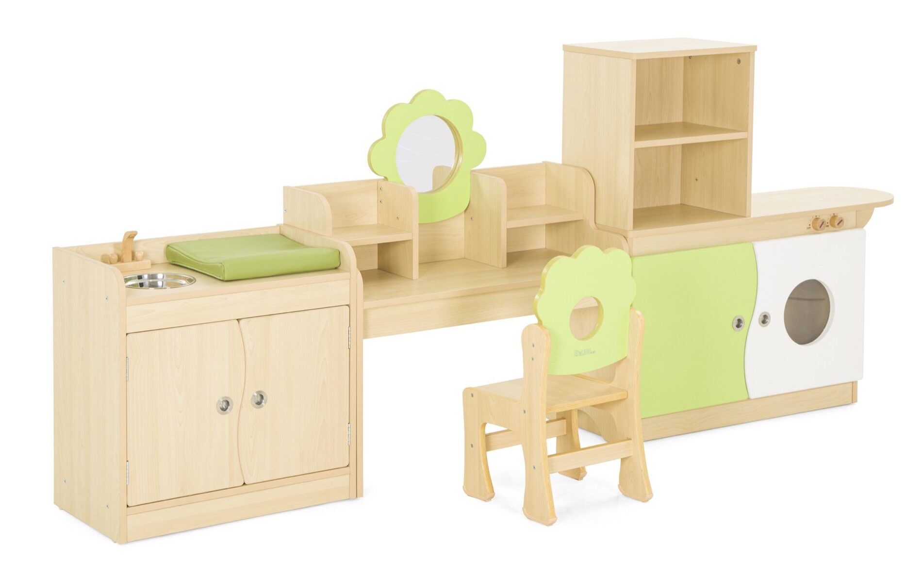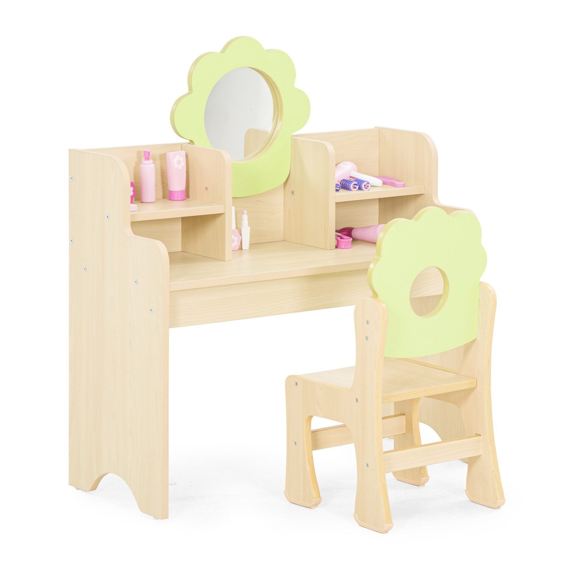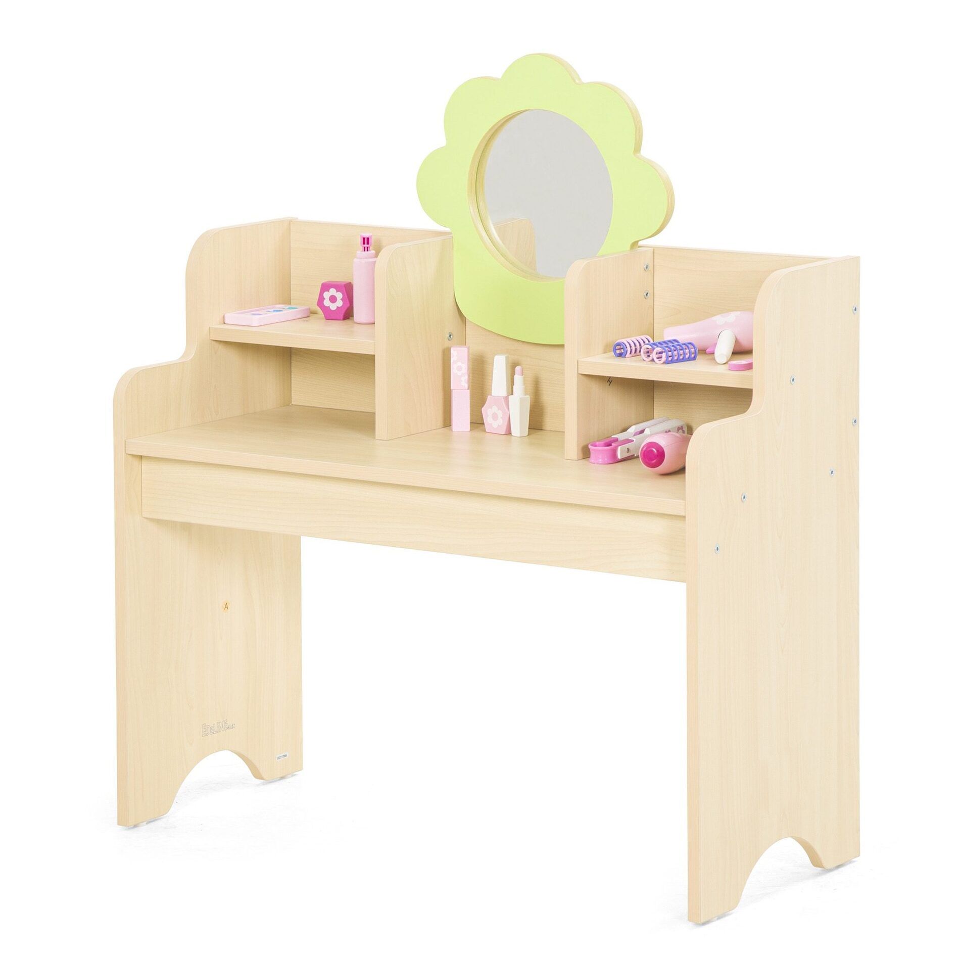 De make-uptafel is perfect voor rollenspellen. Hier kunnen kinderen verschillende kapsels uitproberen en zichzelf opmaken. Het bestaat uit een tafel met veel opbergruimte en een mooie ronde spiegel in een lichtgroene bloemenlijst. De zachte kleuren, met lichtgroen en esdoorn decor, maken de make-uptafel tot een geliefd speelmeubel in de hoek voor rollenspellen.
