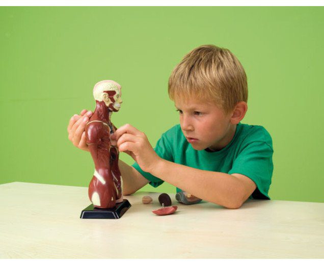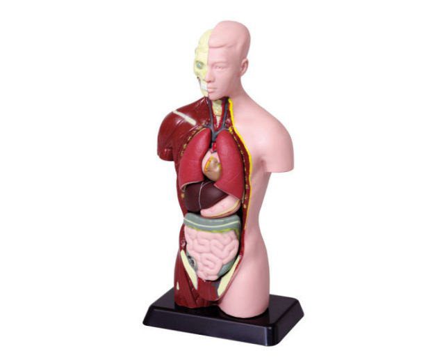 Waar bevinden zich welke organen? Met dit anatomische model leren studenten de menselijke lichaamsstructuur op een levendige manier kennen. De afzonderlijke organen kunnen van de romp worden verwijderd. Leerlingen kunnen hun longen, hart, maag, lever en darmen uitbreiden voor een nadere blik. Op de ene helft van de romp kun je de spieren en de hersenen zien. Het model is 27 cm hoog en is daarom perfect voor elke studententafel. Dit stelt de kinderen in staat om zelfstandig de organen en hun opstelling in het lichaam te onderzoeken.