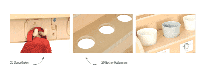De mobiele wasruimtewagen is aan beide zijden te gebruiken en kan gemakkelijk worden verplaatst voor reiniging. De voorkant kan aan beide zijden worden voorzien van herkenningstekens. De wasruimtewagen heeft 20 bekerhouders en 20 dubbele haken voor handdoeken en washandjes. Hij is verrijdbaar, met 4 wielen waarvan 2 vergrendelbaar.