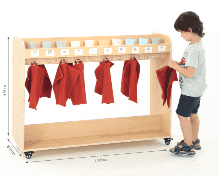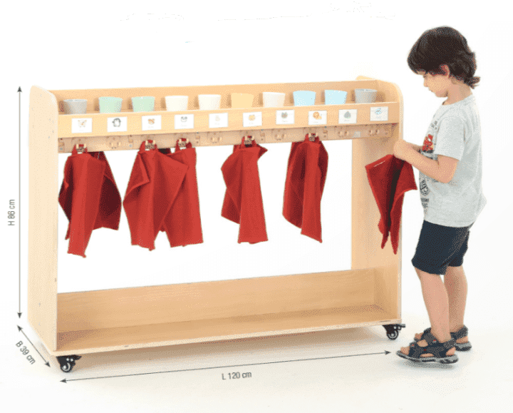 - Materiaal: multiplex, melamine gecoat, esdoorn-look; wielen met rem.