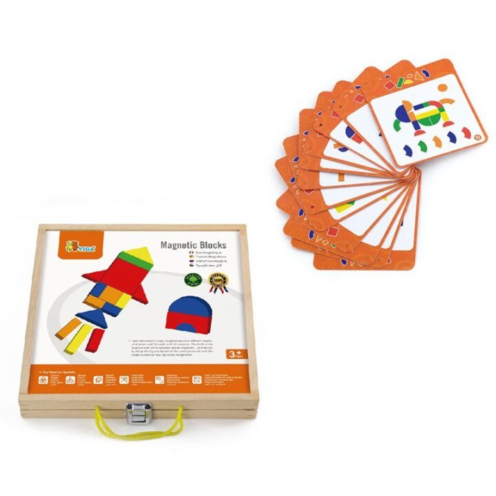 Een mooi afgewerkt 42-delige magnetisch mozaiek in beukenhouten kist. Met de meegeleverde 12-delige set voorbeeldkaarten kunnen 24 verschillende figuren gelegd worden. Bijgeleverd is een mooie houten kist, waarvan de binnenkant aan beide zijden magnetisch is. Een prima spel om de creativiteit en fijne motoriek te stimuleren.