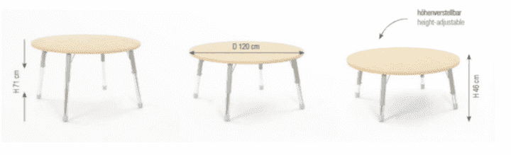 Specificaties voor Olaf Tafel Rond in hoogte verstelbaar 120 cm – Hoogte 46-71 cm