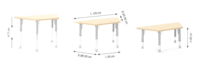 Specificaties voor Olaf Tafel Trapezium in hoogte verstelbaar - 120 x 60 x 60 x 60 cm - Hoogte 46-71 cm