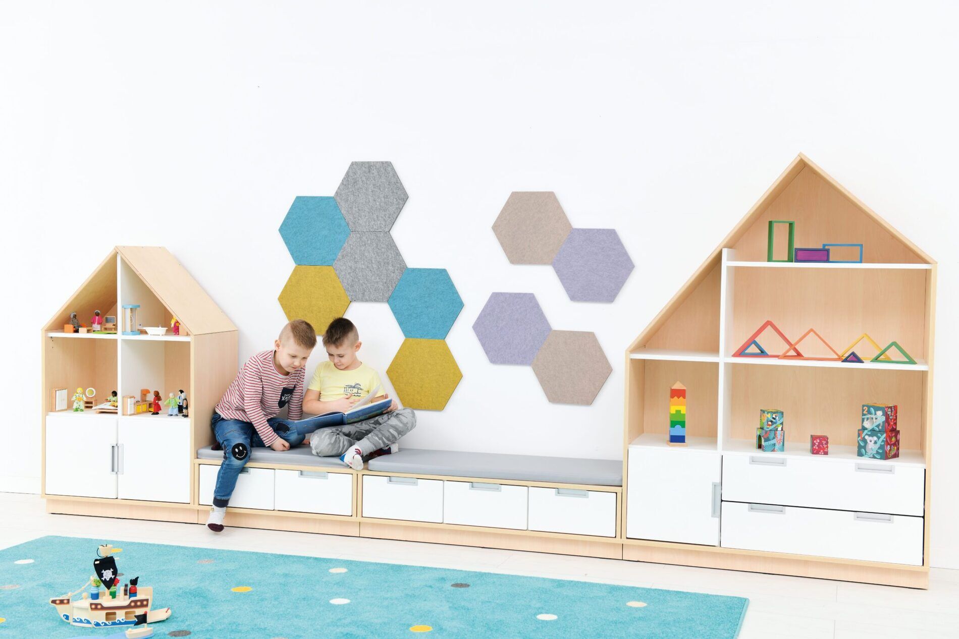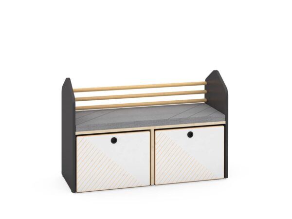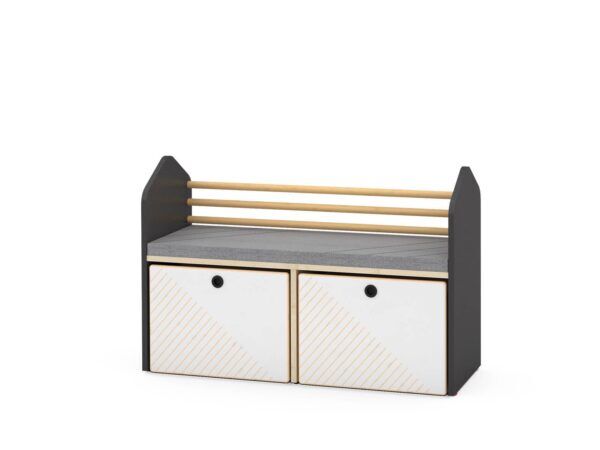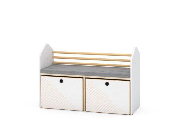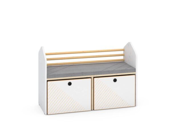 Lage opbergkast met zitje, voorzien van 2 lades. Gemaakt van 18 mm dik gelamineerd karton, in esdoorn.. Schuimmatras bedekt met duurzaam PVC-weefsel, ftalaatvrij, gemakkelijk schoon te maken.