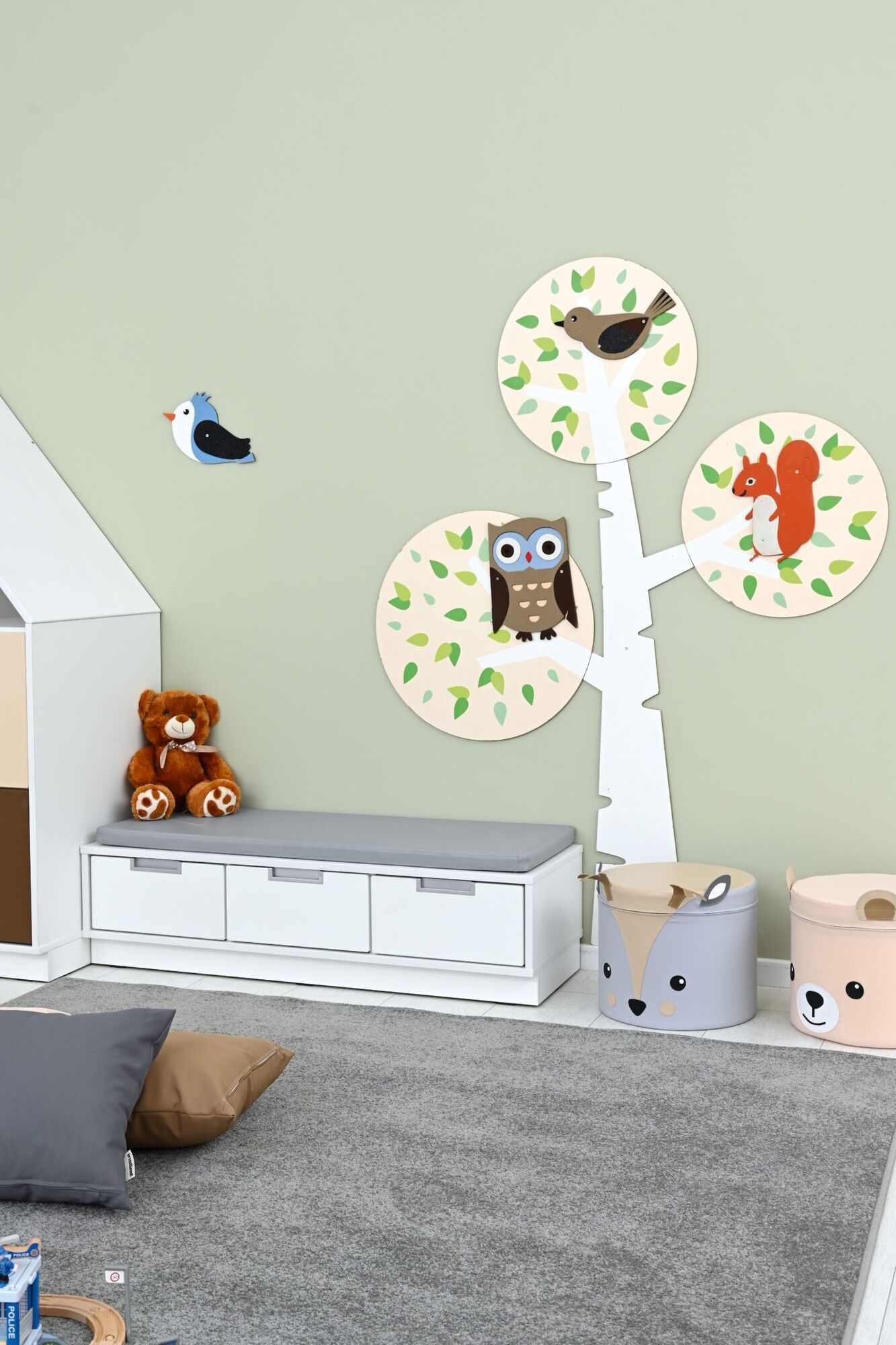 Lage opbergkast met zitje, voorzien van 3 lades.