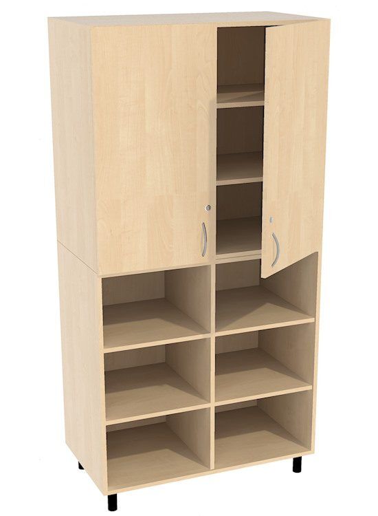 Deze kast is bijzonder praktisch voor op de kinderopvang, BSO of bijvoorbeeld de basisschool. Bovenin heeft de kast 2 deuren met cilindersloten, onderin 6 opbergvakken met veel ruimte zodat kinderen hun eigen spullen kunnen pakken.