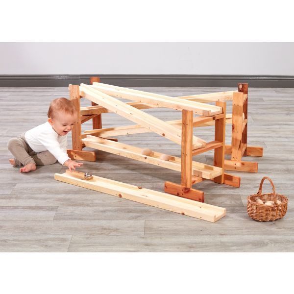 De lichte houten goten zijn ideaal voor kinderen om zelf te dragen en te organiseren, waardoor ze een geweldige bron zijn voor onafhankelijk spel. De set bevat ook drie houten standaarden, die eenvoudig kunnen worden herschikt voor verschillende hoogtes en speelopties, wat zorgt voor veelzijdigheid en creatieve speelervaringen.