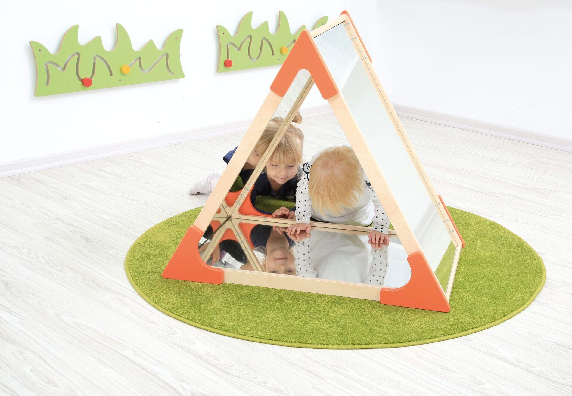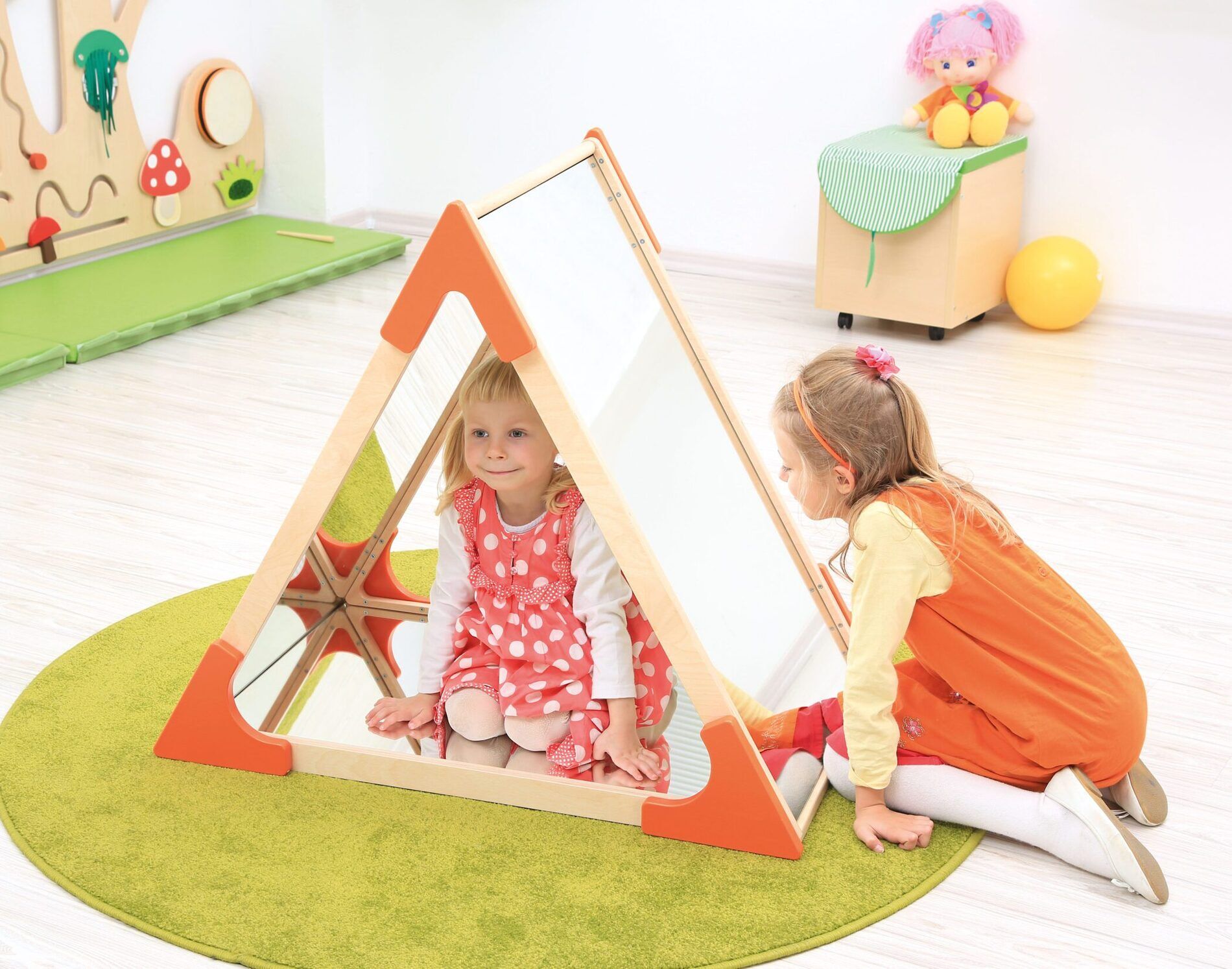 Dankzij de spiegels die in de vorm van een driehoek zijn opgesteld, kunnen kinderen een ander perspectief krijgen, waardoor de ruimte in de spiegel voor hen nog fascinerender wordt. Het bekijken van hun reflecties of verschillende objecten is een zeer interessante ervaring.