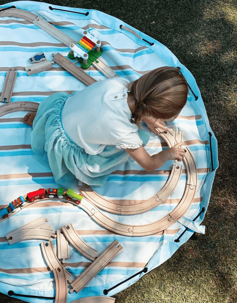 De Play&Go outdoor is de unieke waterdichte oplossing om al uw spullen mee te nemen voor een dagje strand, om naar het park te gaan of voor een geweldige picknick. Leg de opbergzak open om op te zitten of erop te spelen. Als de grond nat is, blijf je zeker droog. Tijd om te gaan? Trek gewoon aan het touw en alles is netjes erin opgeborgen. De verstelbare schouderriem maakt het gemakkelijker om te dragen. De tas is ook voorzien van een zand/vuil ontsnappingsgat dus geen extra kg's om mee te nemen.