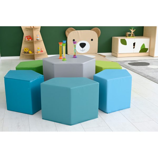 Een gezellig gesprek, met z'n allen lezen of een spelletje; het kan allemaal met deze foam zithoek in unieke kleuren. De set bestaande uit poefs en een tafel, gemaakt van schuim bedekt met duurzaam vinyl.
