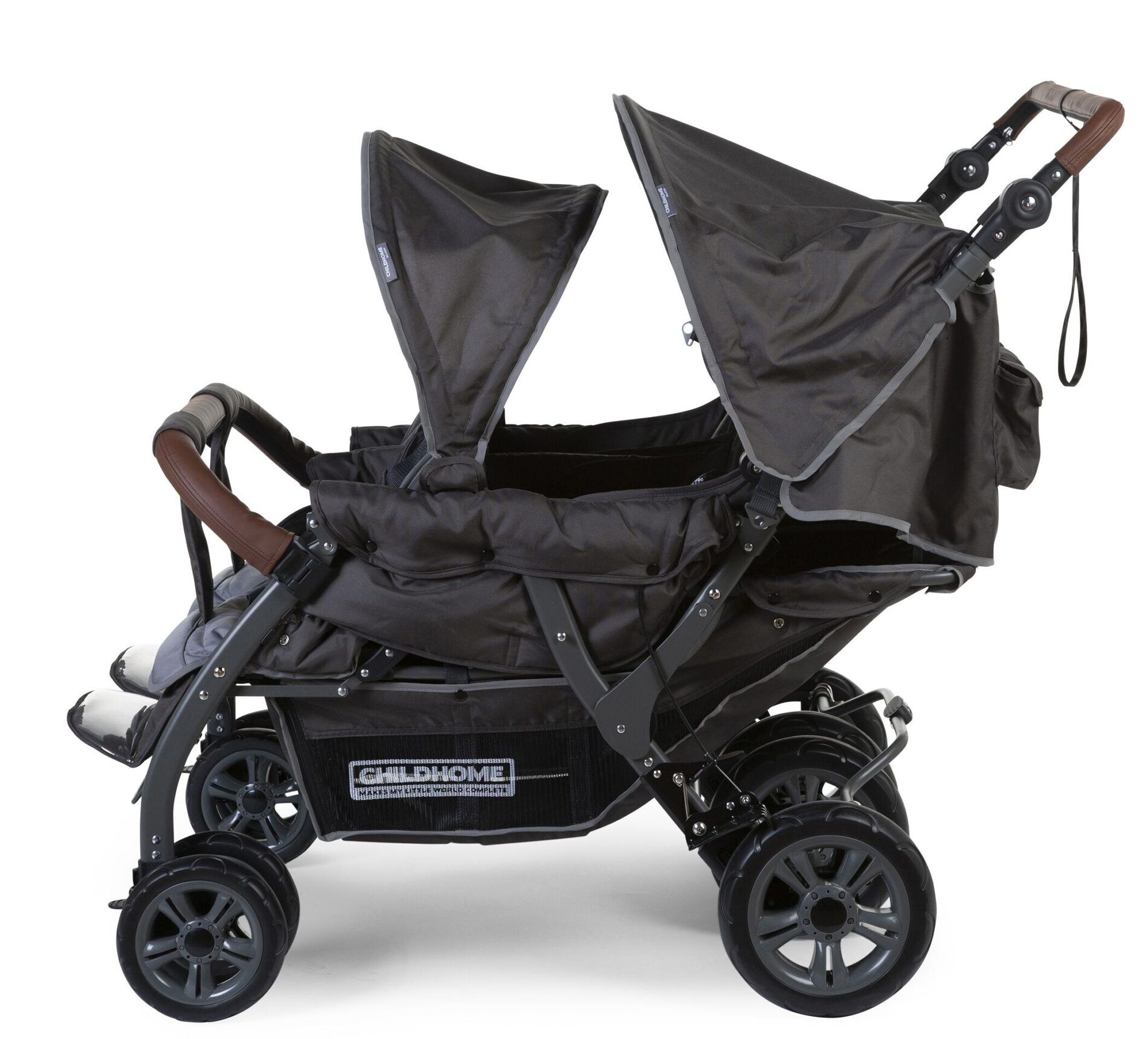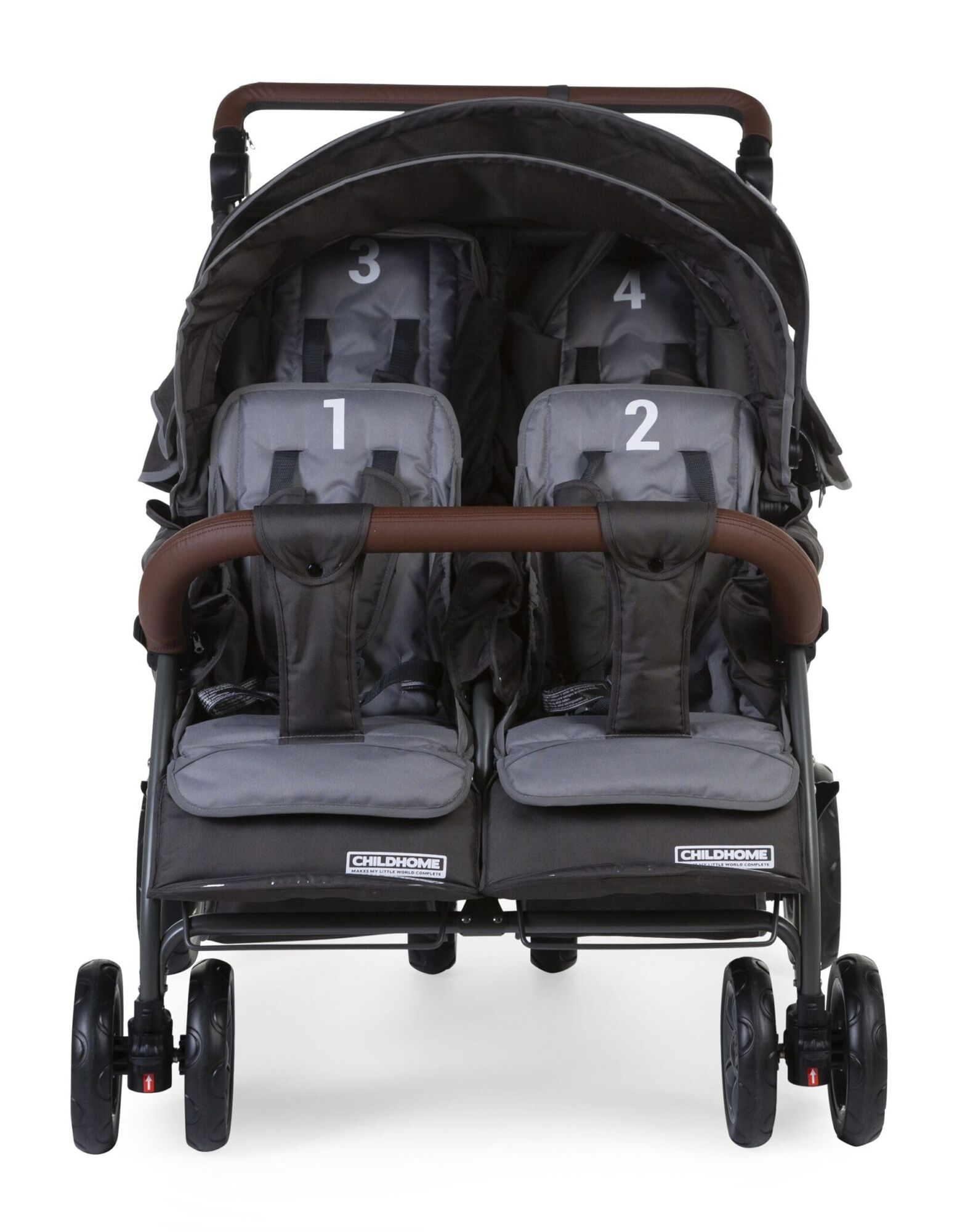 4persoons wandelwagen Autobrake met lederlook handvat beantwoordt aan de vraag van vele kinderdagverblijven en onthaalmoeders. De Quadruple Autobrake biedt namelijk de mogelijkheid om met 4 kleuters, van 6 maanden tot 15 kg, tegelijk op stap te gaan.