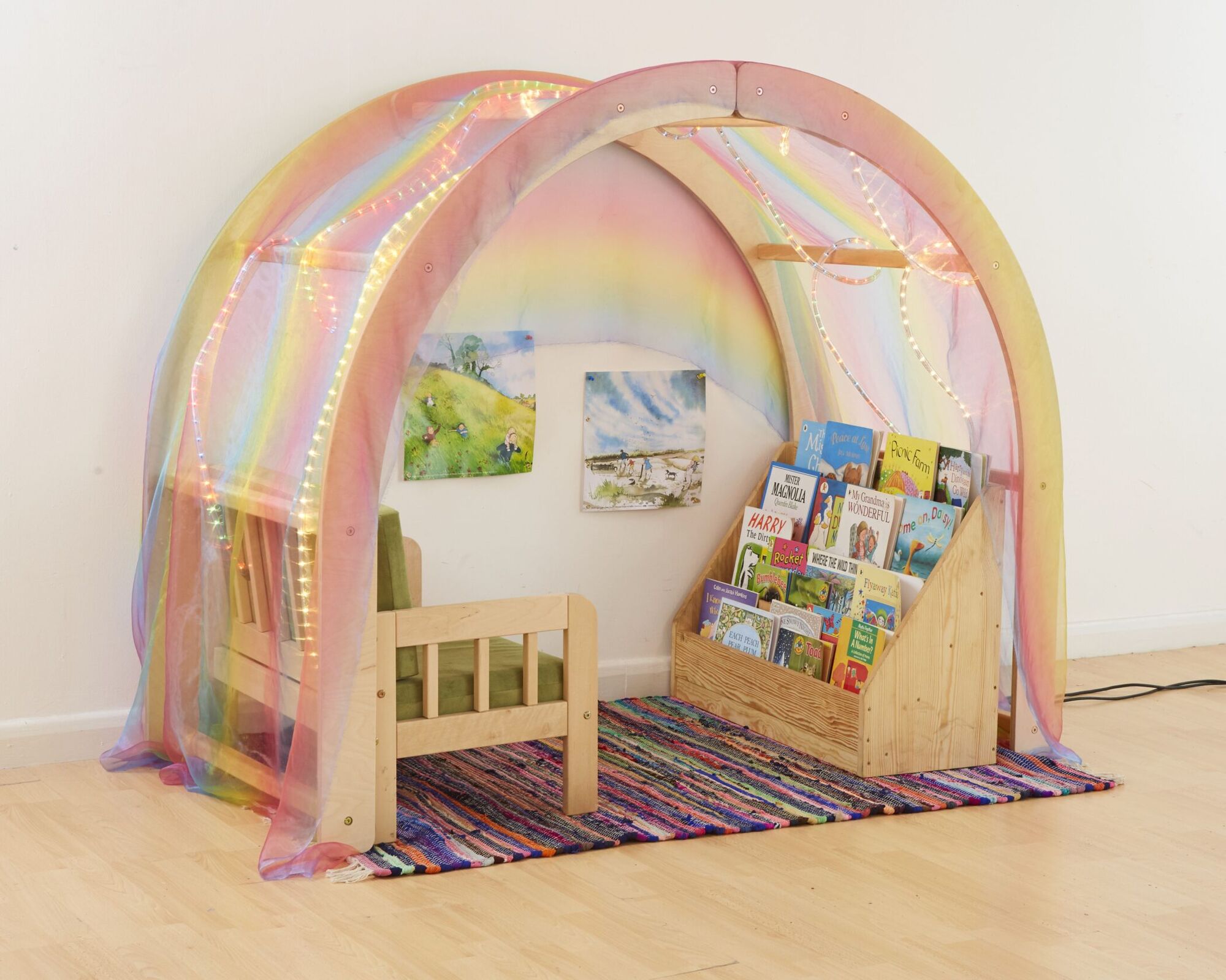 Kinderen kunnen eronder spelen, fantaseren en op avontuur gaan. De regenboogkleuren zorgen voor plezier en prikkelen de verbeelding. Ideaal voor spel, ontdekken en leuke momenten samen.