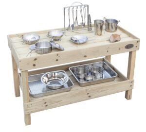 Dit servies is gemaakt van roestvrij staal en kan zowel binnen als buiten worden gebruikt. Het is perfect te combineren met de buiten speelkeukens. Ervaar rollenspellen, verbeter samenwerkingsvaardigheden en ontwikkel sociale interactievaardigheden.