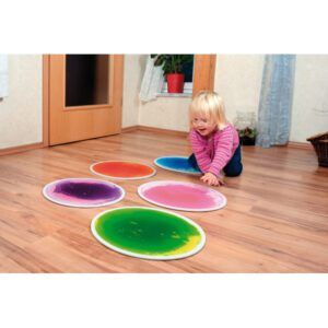 Vloeiend bewegingsspel: set van 4 ronde sensorische vloertegels met levendige vloeibare kleuren die tot leven komen bij elke stap, sprong, dans of huppel, voor extra spanning en betrokkenheid tijdens het spelen.
