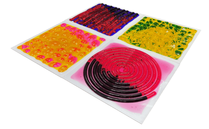 Betoverende zintuiglijke ervaring: set van 4 zintuiglijke tegels gevuld met vloeibare gel met textuur voor een meeslepende tactiele en visuele reis, die beweging en verkenning stimuleert.