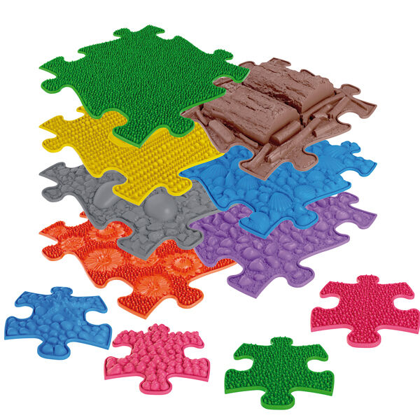 Deze zintuiglijke platen hebben verschillende gestructureerde oppervlakken. Door er met je blote voeten overheen te lopen, voel je verschillende natuurlijke structuren als bijvoorbeeld dennenappels, takken of kiezels. De verschillende structuren stimuleren de voetreflexzones en versterken de voetspieren, wat zeer belangrijk is voor de houding van de kinderen.