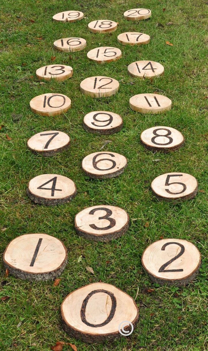 Beschrijving Set houten genummerde stapstenen – 21 stuks