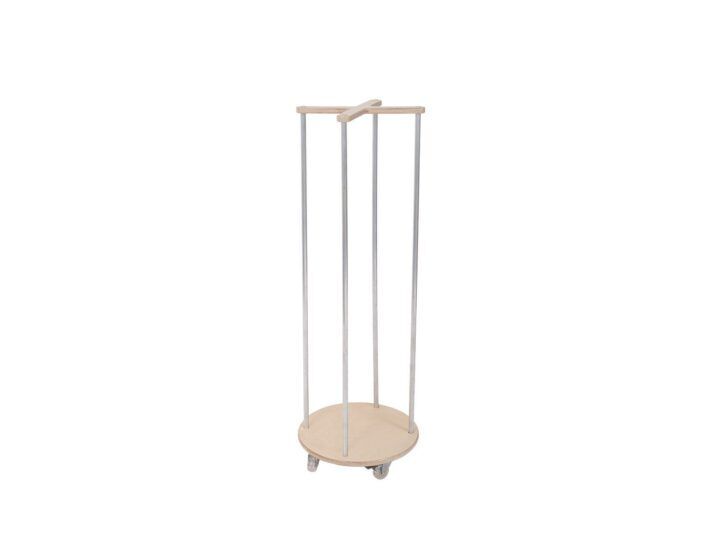 Een set van 12 poefjes in ingetogen, natuurlijke kleuren. Voor hun opslag is de standaard op wielen perfect.