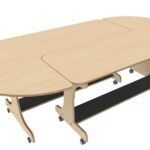 Multifunctionele hoogzittafel set in J-vorm. Door de ronding in de tafel kunnen er kinderstoelen aan de kopse kant gezet worden zonder dat deze ruimte van een bank innemen. Wanneer 2 J-tafels gecombineerd worden ontstaat er een ovalen vorm, of schuif de tafels iets uit elkaar zodat een leidster in het midden kan zitten.