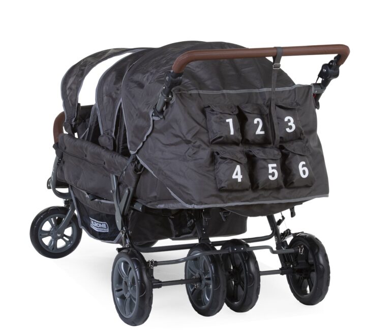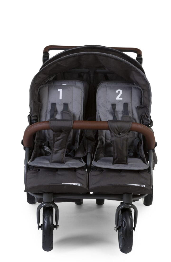 De nieuwe meervoudige kinderwagens hebben een trendy lederen handgreep en veiligheidsbumper. De randen zijn afgewerkt met reflecterende strips om de zichtbaarheid in het donker te vergroten. Kleinere tassen werden toegevoegd met nummers die overeenkomen met de stoelen. Op deze manier is het gemakkelijk om te onthouden welke fopspeen bij welk kind hoort.