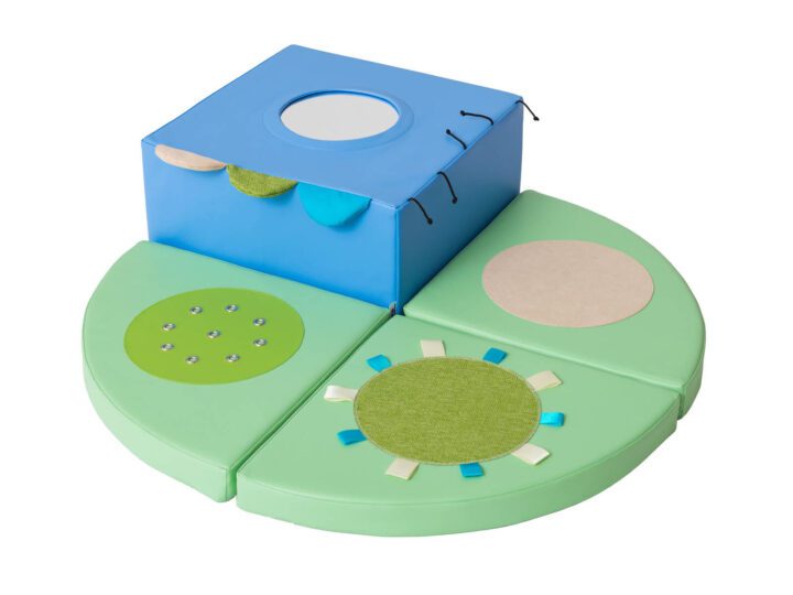 De set bestaat uit 4 elementen: kubussen met een spiegel, touwtjes en 3 "buidels" waarin ritselend folie zit, een piep en boekweitdoppen, en 3 matrassen met 3 verschillende stoffen erop genaaid. Spelen met het gebruik van individuele elementen zorgt voor veel prikkels en ontwikkelt niet alleen de tastzin, maar ook het zicht.