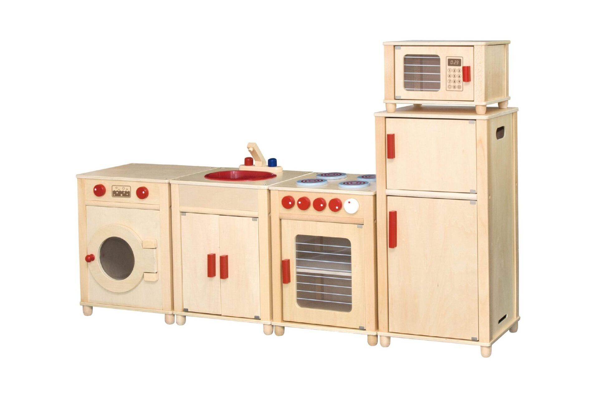 Een mooie en degelijke speelkeuken, gemaakt van beukenhout en berken multiplex. Alle deuren zijn voorzien van metalen scharnieren en de knoppen klikken als je er aan draait. De Speelkeuken is zeer geschikt voor de kinderopvang.